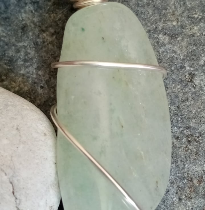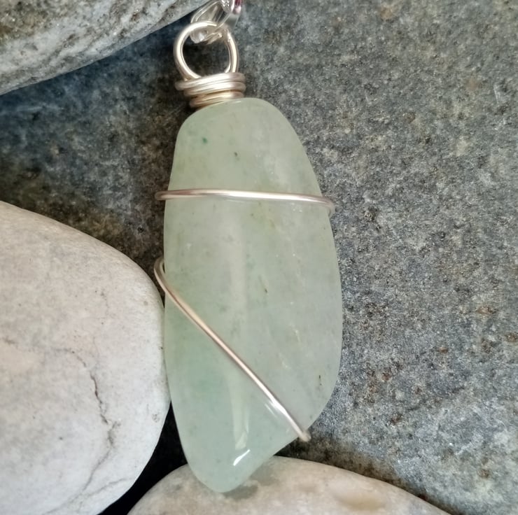 Wire-wrapped natural Aventurine tumble stone with silver plated snake chain.