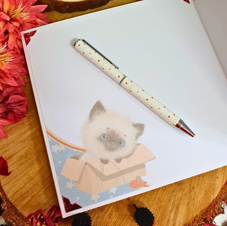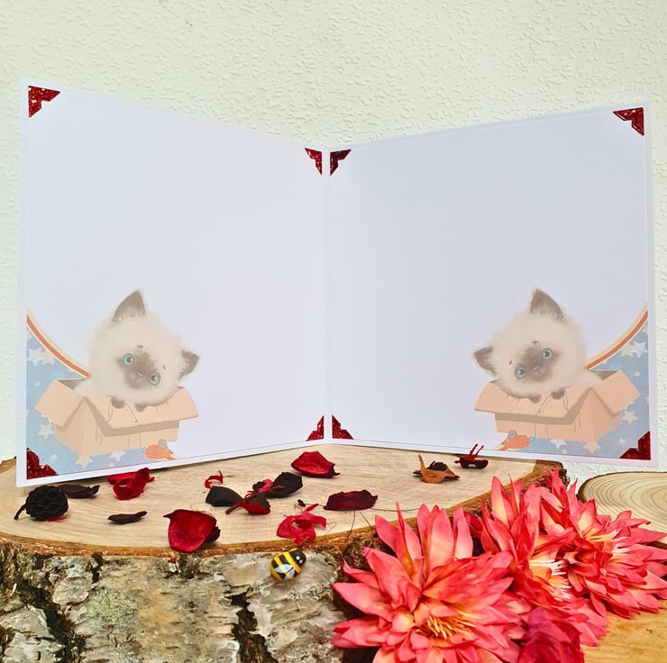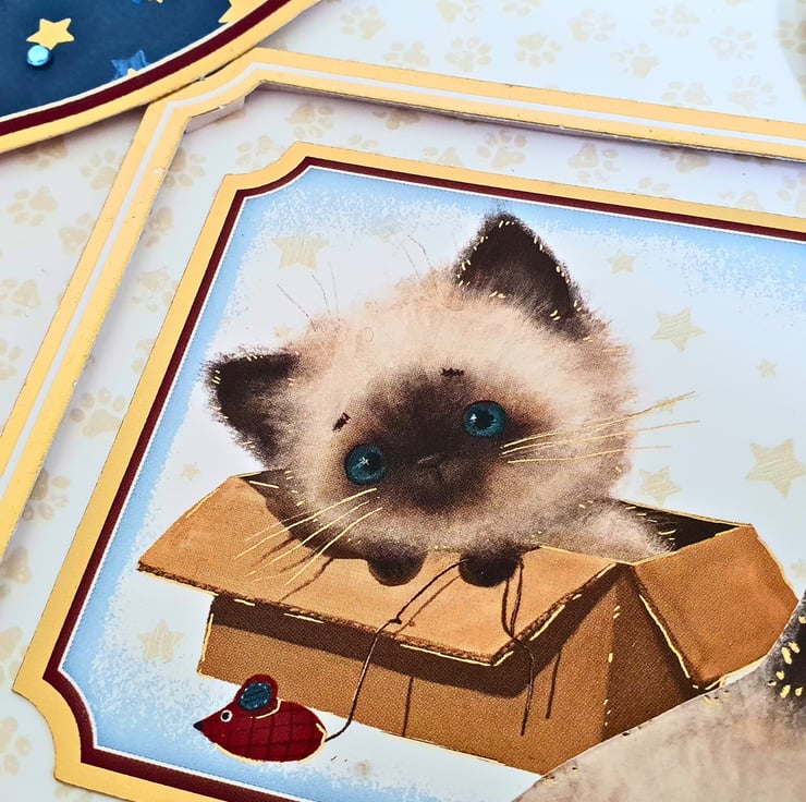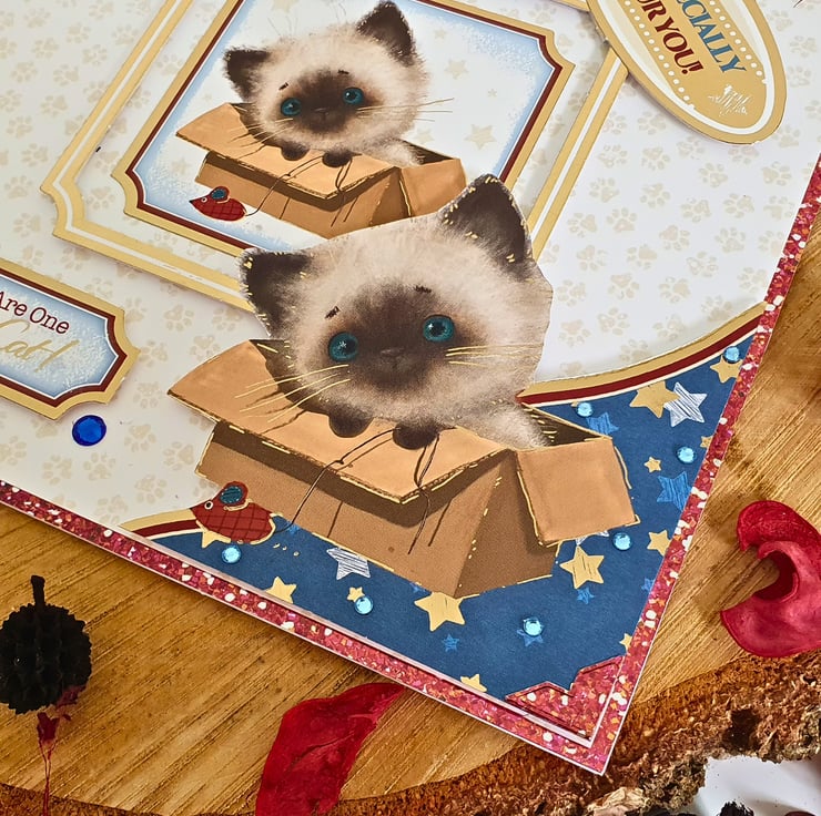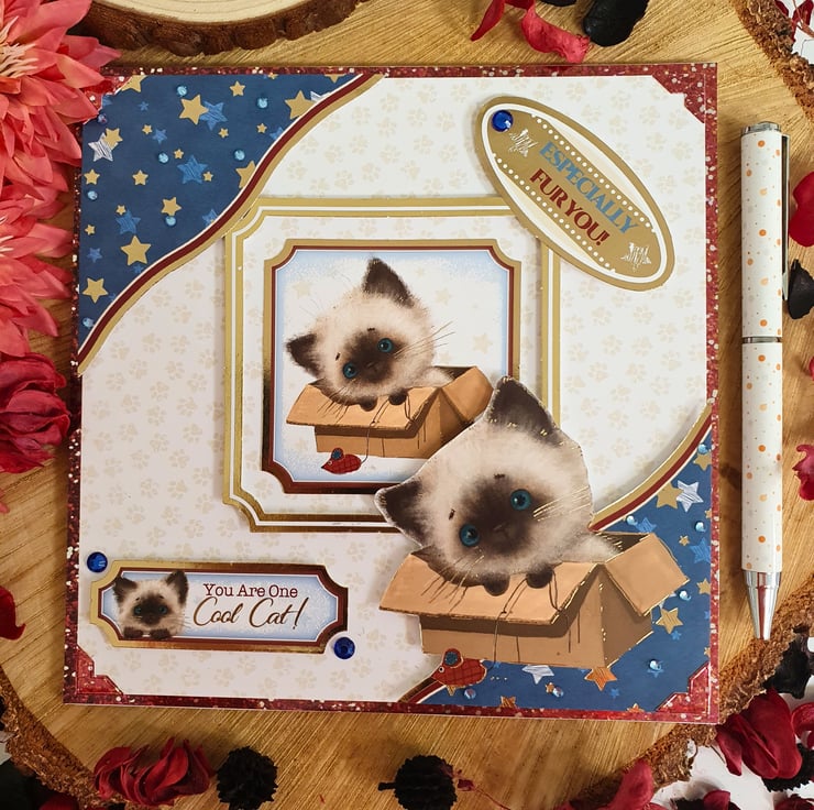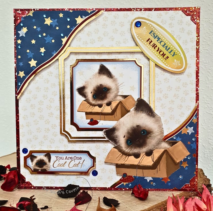 The card consists of mats & layers of red mirror card & cream cardstock with a paw pattern. The main square topper showing the kitten inside the box, is in the middle of the card, surrounded by a matching frame. 2 sentiments are displayed in opposite corners, reading "Especially Fur You" & "You Are One Cool Cat". 2 decorative panels cover the other 2 corners, with the same image & stars in blue background. It is decorated with light blue diamante. Finished with a double, coordinating insert, blank for you to add your message & wishes & bordered with decorative photo corners.