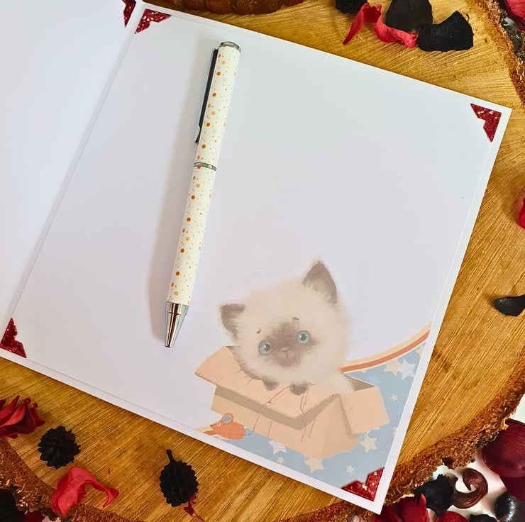 A playful, animal themed, handmade card with a kitten peeping out of a brown parcel box, ideal not only for birthdays, but to say thank you, just because, or any occasion you would like to pass on your wishes & messages with a funny touch!