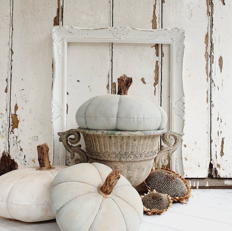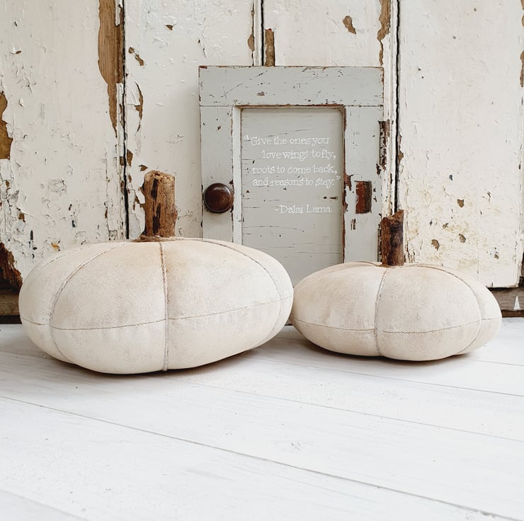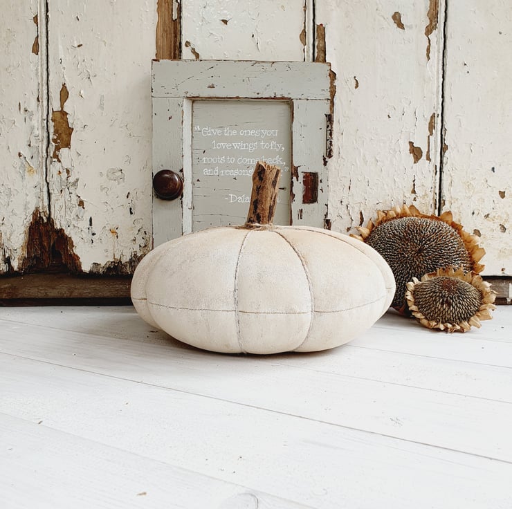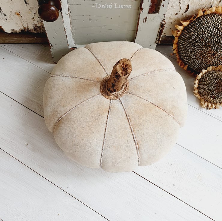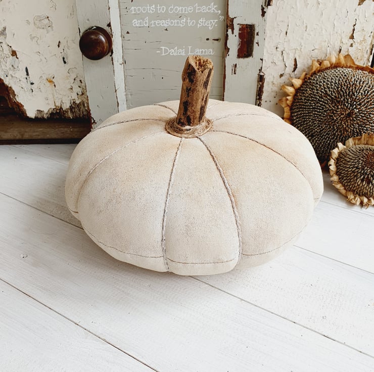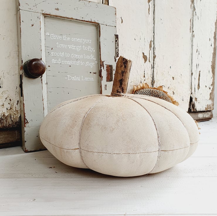 This is a full sized heirloom style pumpkin made in the American Primitive Style. It would look great as a table centrepiece for the Autumn season and Halloween and can be used year after year. The fabric has been stained with coffee, cinnamon and vanilla. It has then been painted and sanded down to give it an aged appearance. The stalk has been made from a large twig and I have then dusted it down with cinnamon to finish.