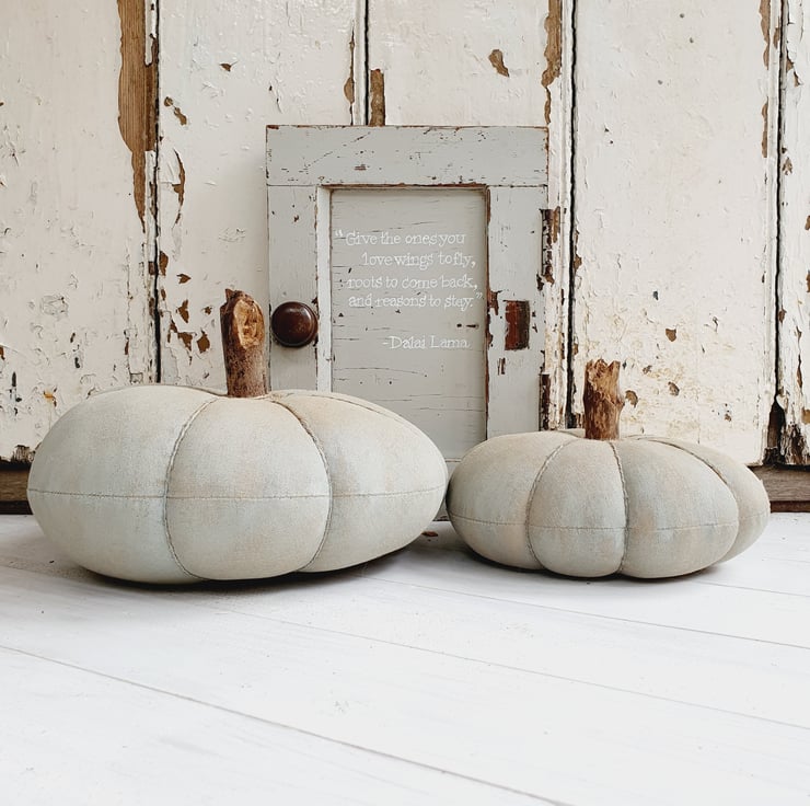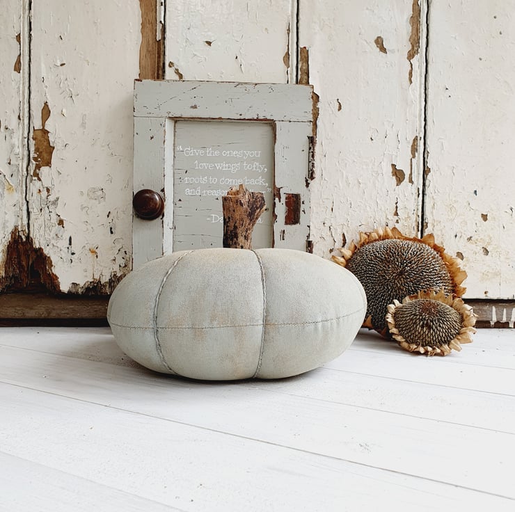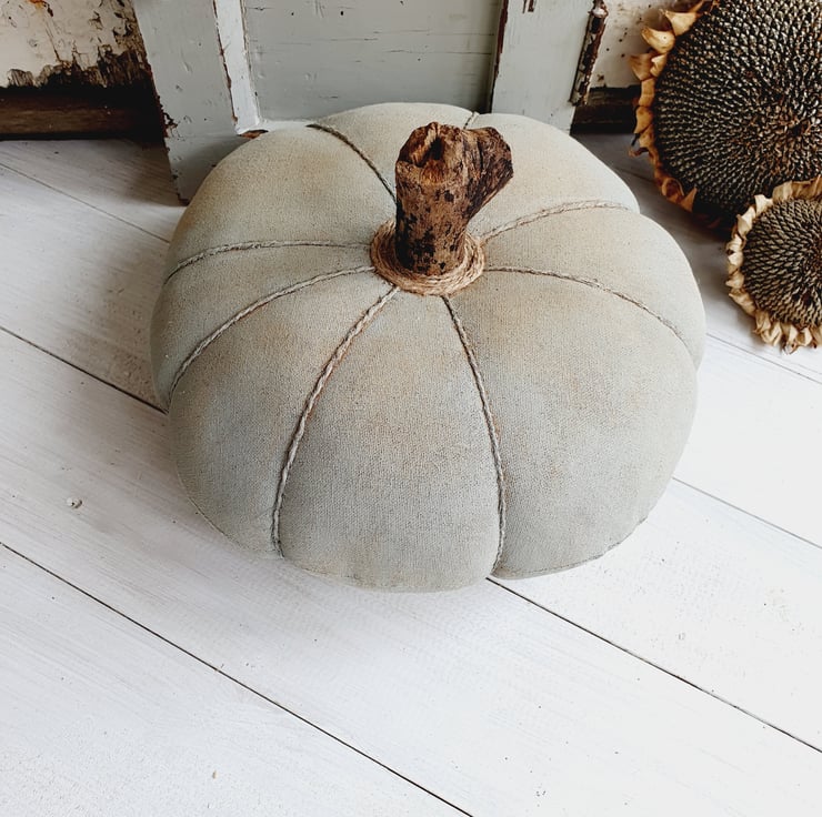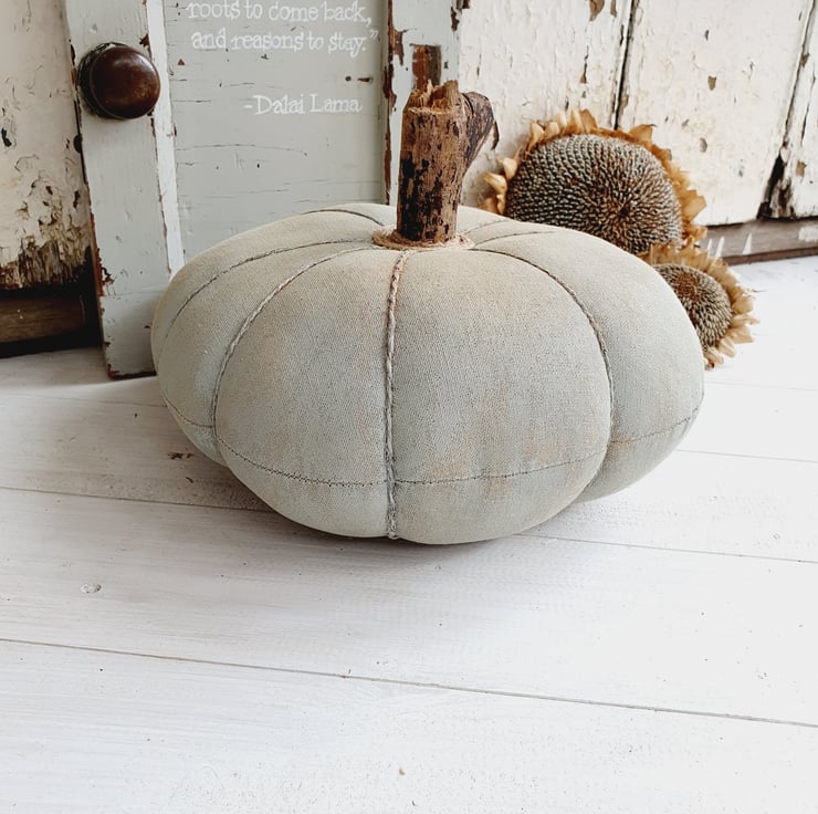 This is a full sized heirloom style pumpkin made in the American Primitive Style. It would look great as a table centrepiece for the Autumn season and Halloween and can be used year after year. The fabric has been stained with coffee, cinnamon and vanilla. It has then been painted and sanded down to give it an aged appearance. The stalk has been made from a large twig and I have then dusted it down with cinnamon to finish.