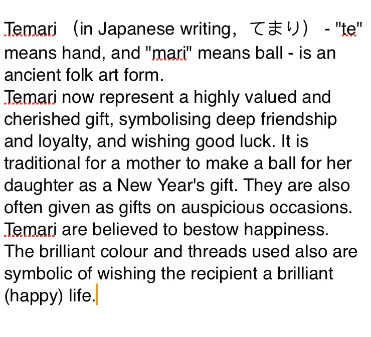 A fascination with beautiful Japanese crafts led to a determination to master the challenging art of Temari, requiring Zen-like concentration and an obsessive attention to detail.
