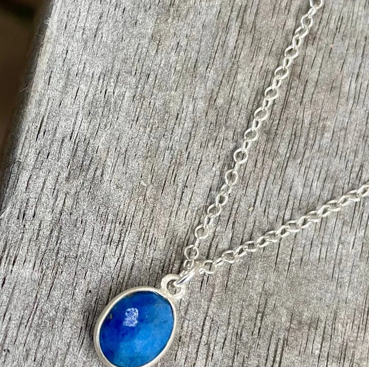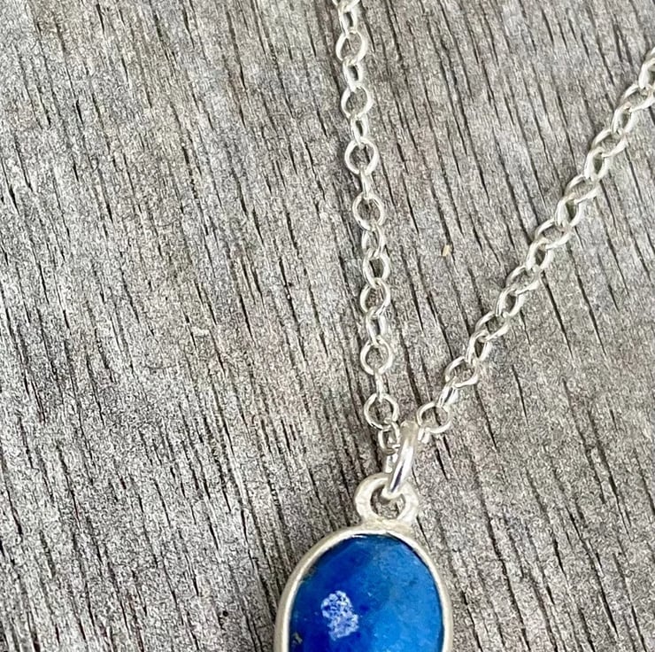 A faceted oval gemstone lapis lazuli pendant necklace. The lapis lazuli pendant is 12mm in drop and is set in sterling silver. Please chose a length of sterling silver chain you would like, a 16 inch, an 18 inch sterling silver chain, please message which chain length that you would like, . Wear alone of wear as a layering necklace with other necklaces.