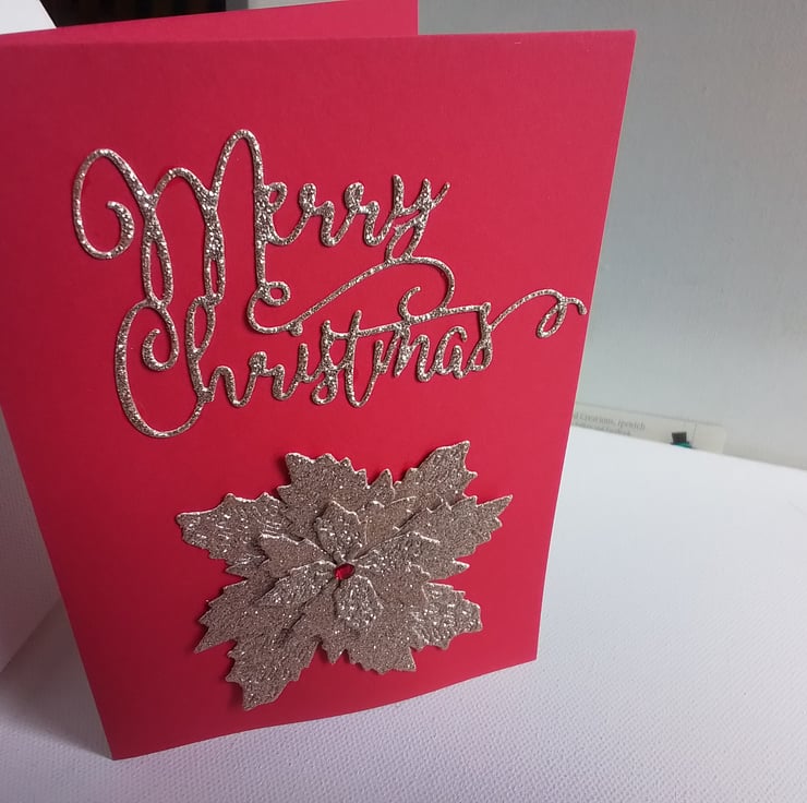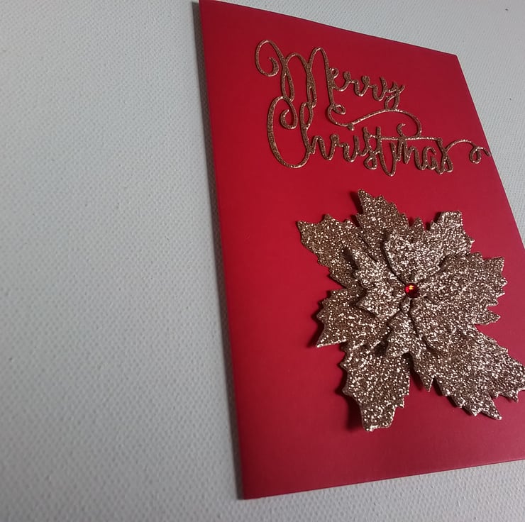 A beautiful red Christmas card with a glittery gold poinsettia.