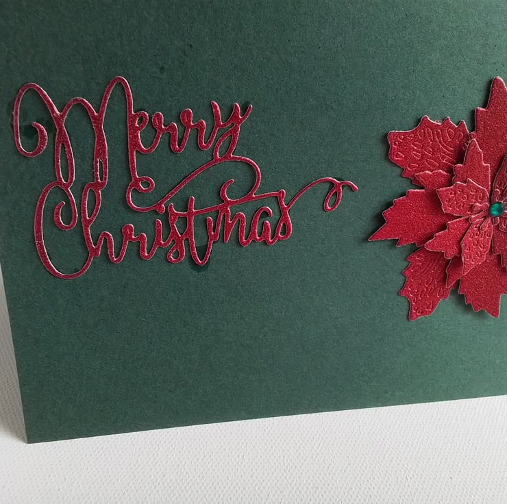 A beautiful deep green Christmas card with a glittery red poinsettia sitting to one side.