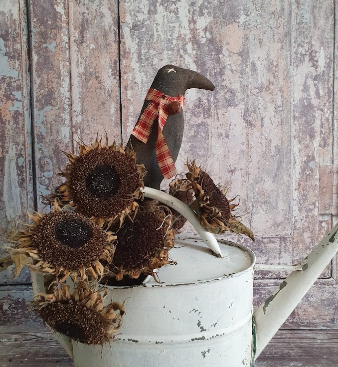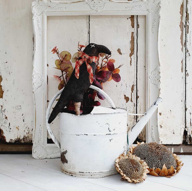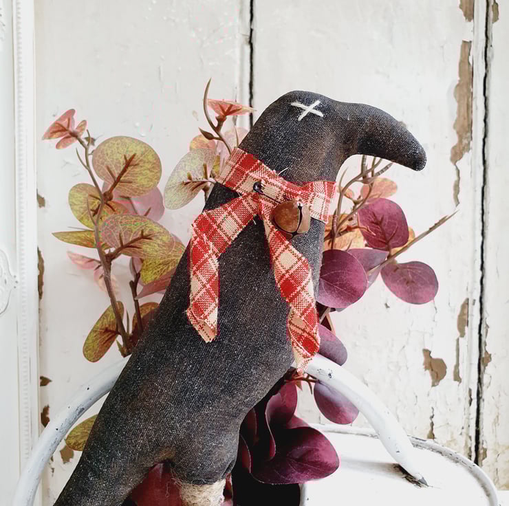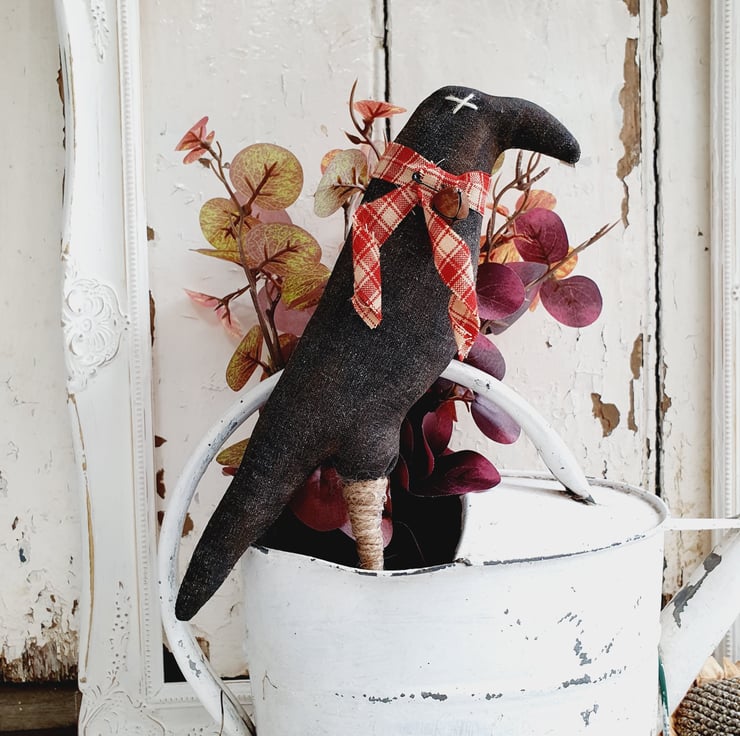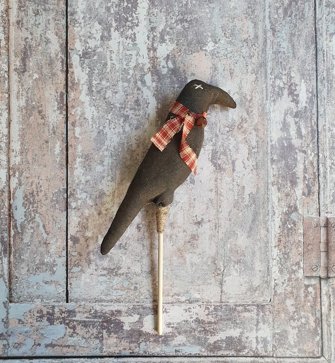 This is a American primitive style pot poke. The crow has been made out of aged fabric. I age my own fabric with coffee, cinnamon and vanilla and then paint using acrylic paint. Once dry I sand it down to give it an aged, worn look and finally give it a good dusting of cinnamon. It has been finished with a handmade ribbon and a small bell has been pinned to it.