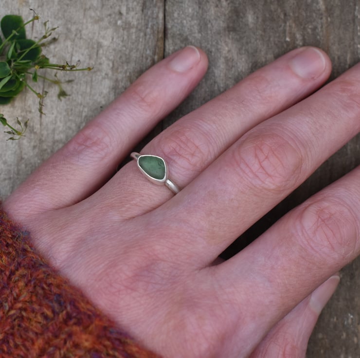 Sea Glass & Recycled Sterling Silver Ring, Size L, Teal Green Scottish Sea Glass