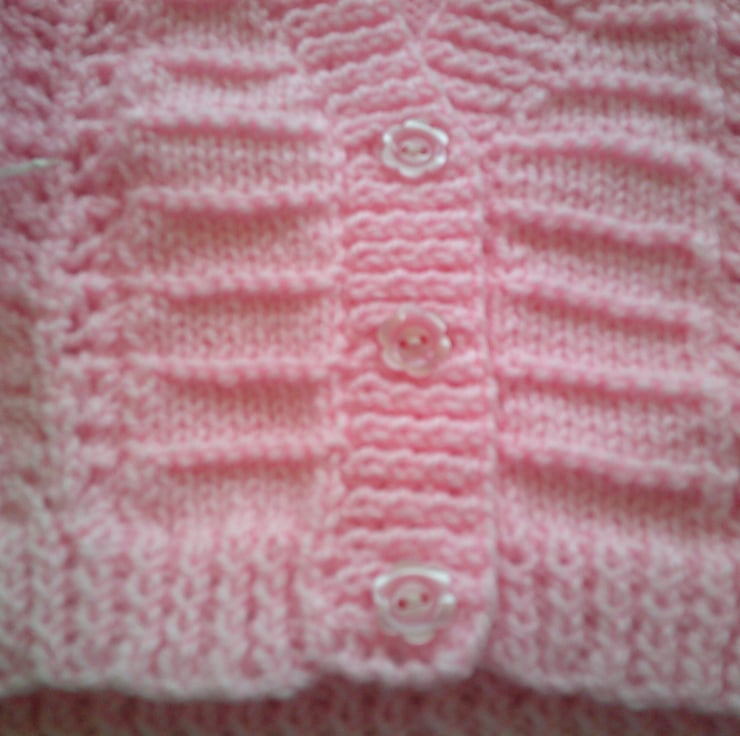 This hand knitted V Neck pink cardigan has lace panels and purl design on the fronts with just the purl row design on the sleeves and back.