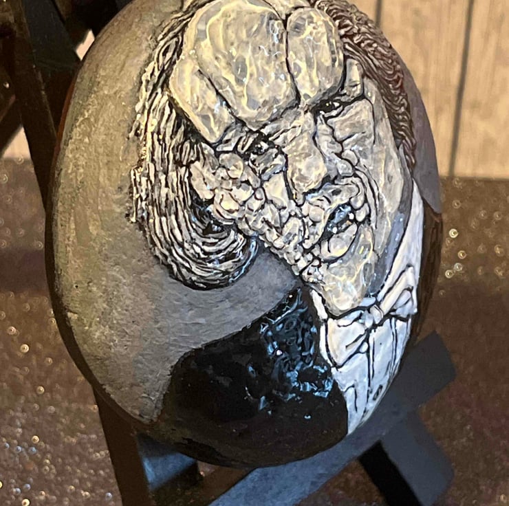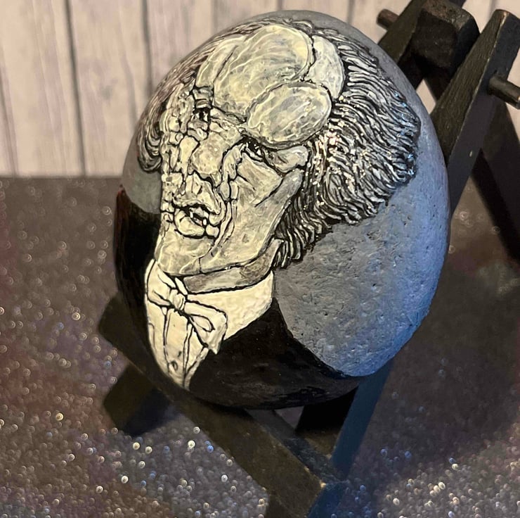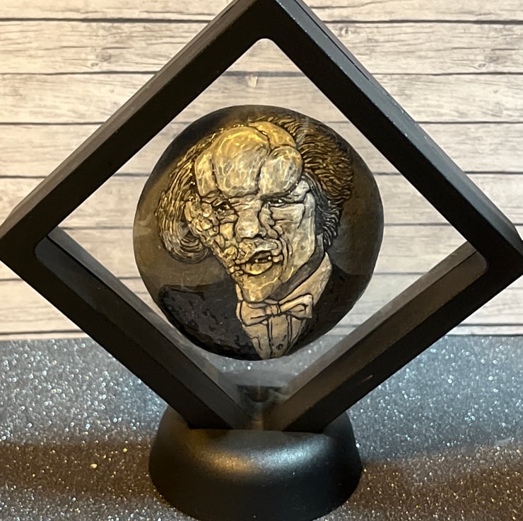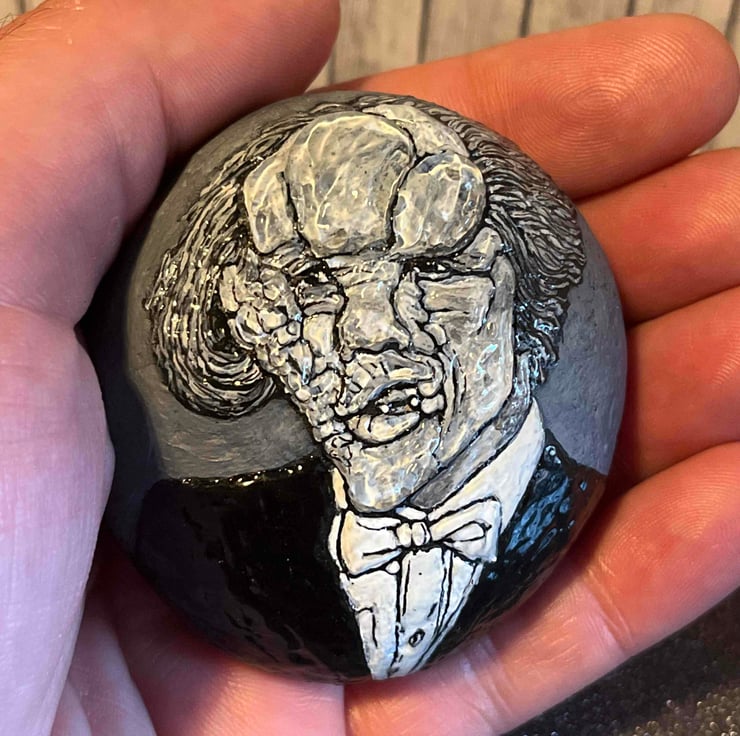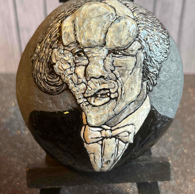This hand painted Joseph Merrick (The Elephant Man) stone was created using acrylic paint pens and sculpted with 3D pearl effects (craft resin)