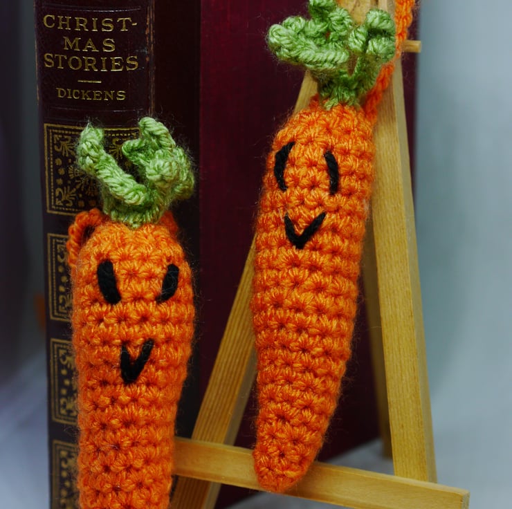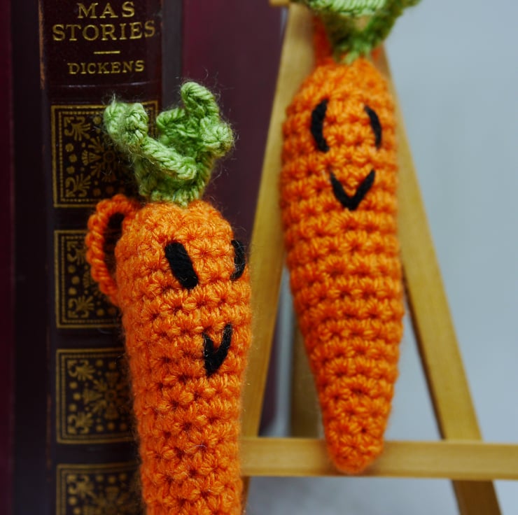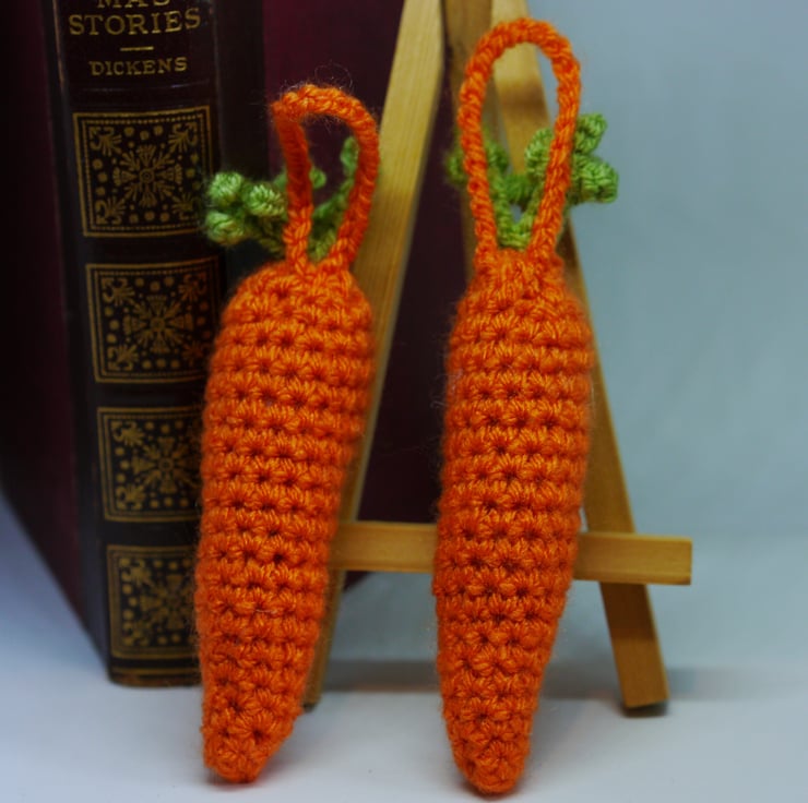 Carrots have always been associated with Christmas be it a treat left out for Rudolf, as an integral part of Christmas dinner or more recently as the main character in a well know super market advertising campaign. This pair of cute crochet carrots are bond to bring a smile to anyone as they adorn the tree or as part of any festive display. Made in soft orange and green yarn, adorned with a cute face and finished with a handy hanging loop they measure approximately 12cm long and a lightly stuffed to give a pleasing shape. as a multi use decoration they are also great for Easter.