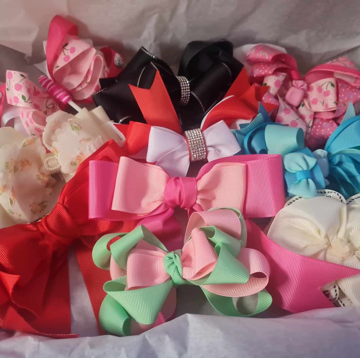 These hairbow bundles have been used as demo photos for my bow page they have never been put in any hair just for product placement. All of these bundles come boxed with tissue paper around them perfect for that little someone. There are 10 bows