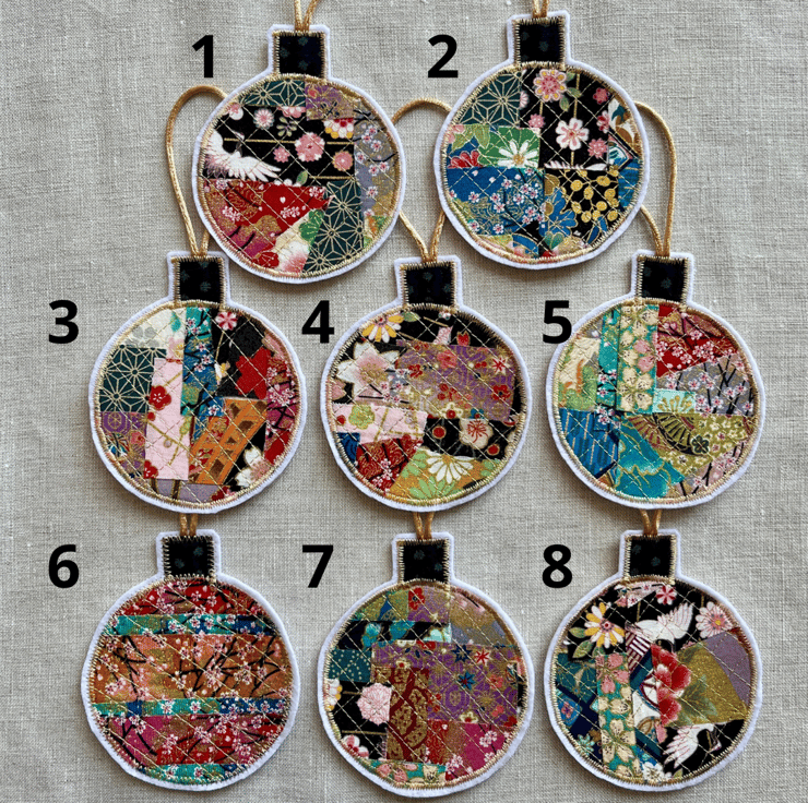 These Christmas bauble decorations have been created from pieces of Japanese fabric left over from other projects.