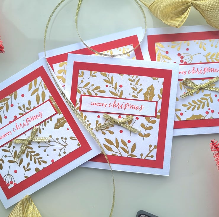 Measuring 10 x 10cm, these four compact cards in red and gold tones do not lack impact.