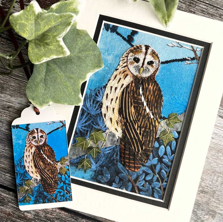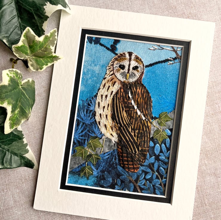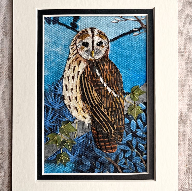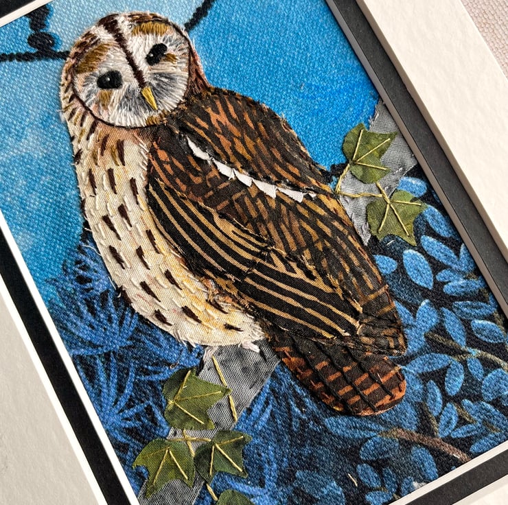 A hand sewn textile picture of a tawny owl. A lovely original gift for a bird lover.