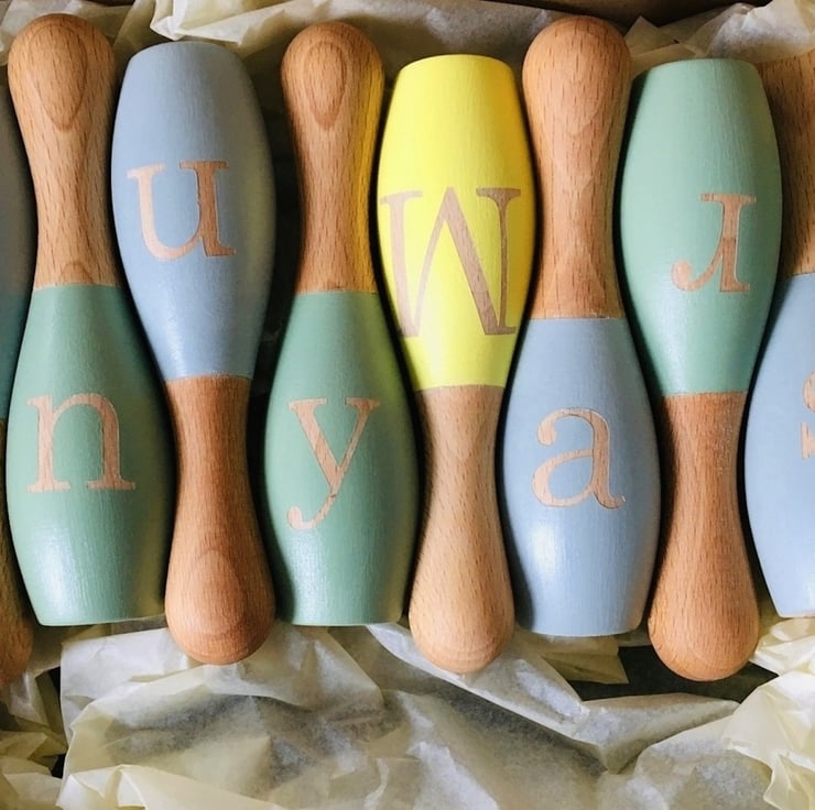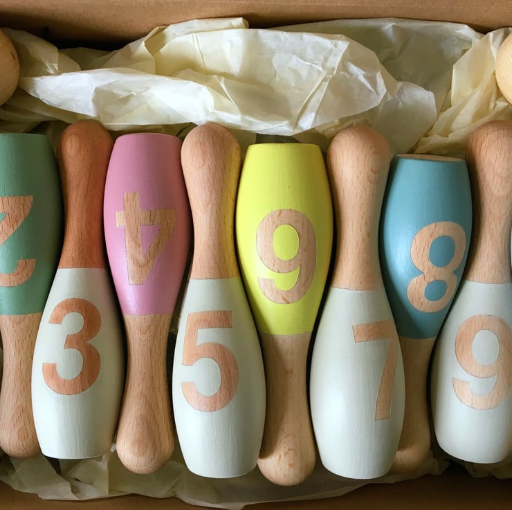 This lovely Montessori Baby Bowling Set encourages little ones to learn while they play. It includes 10 x solid beech bowling pins stencilled in a tasteful font with numbers 0-9 on one side and your chosen name/word(s) on the reverse. Each pin measures 12.5cmH x 11.5cm circumference making them perfect for tiny hands, and there's also a solid beech bowling ball. It comes in 2 options of either pre-chosen colours and numbers of: Cream No. 1, Green No. 2, Cream No. 3, Pink No. 4, Cream No. 5, Yellow No. 6, Cream No. 7, Blue No. 8, Cream No. 9, Grey No. 0. Your chosen name/word's will be stencilled on the reverse, simply click on the 'Choose Options' button.