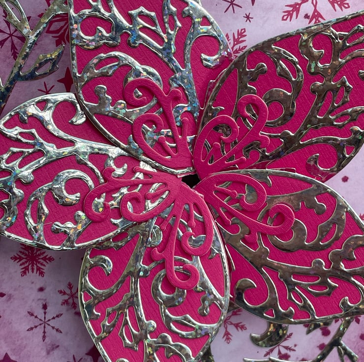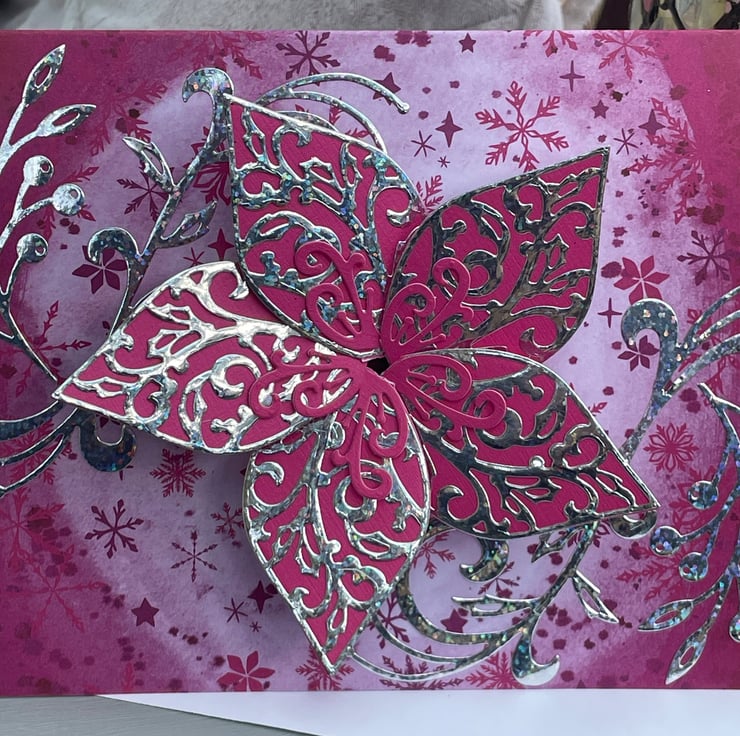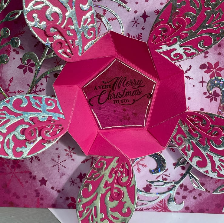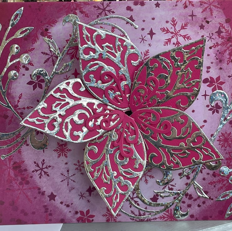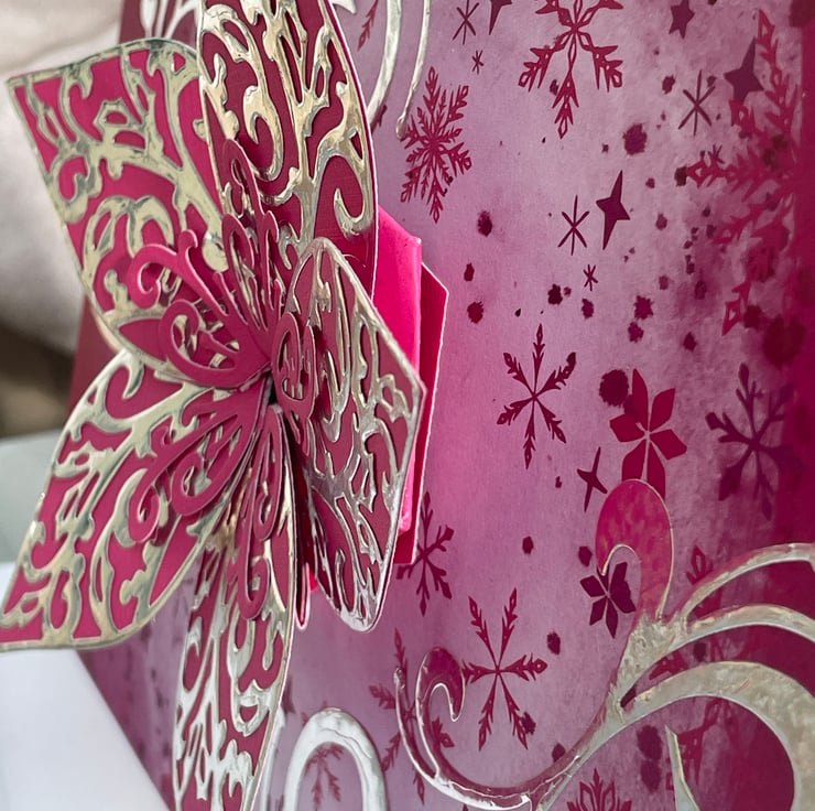 Christmas will soon be upon us. This beautiful luxury Christmas card is something special. It is A5 in size and features a swirling deep ink and white snowflake backing paper. This is topped with silver swirls to two corners. The main feature of the card is the kinetic poinsettia. The flower is made of pink card and the petals are topped with silver swirl decoration. The flower has a mechanism that allows it to spin 360 degrees and, if pulled gently, the petals open to reveal a Christmas message that says A very merry Christmas to you. A truly unique and beautiful way to send Christmas greetings to a loved one.