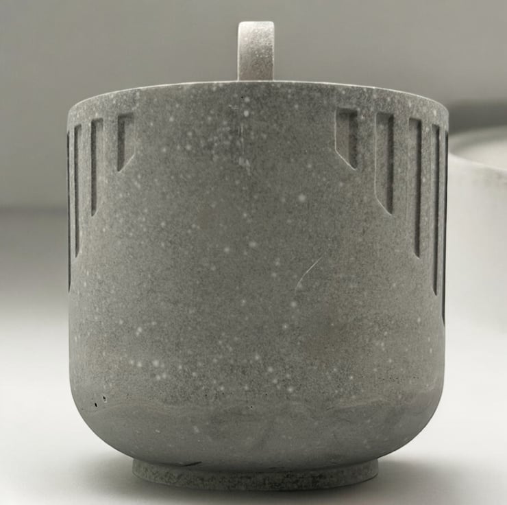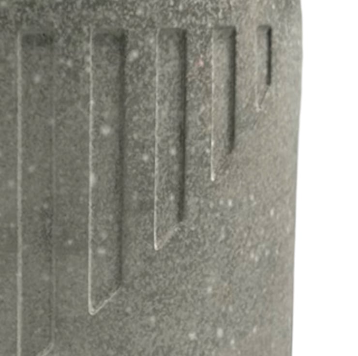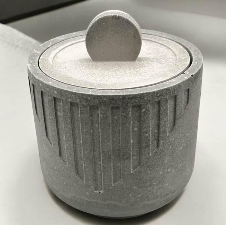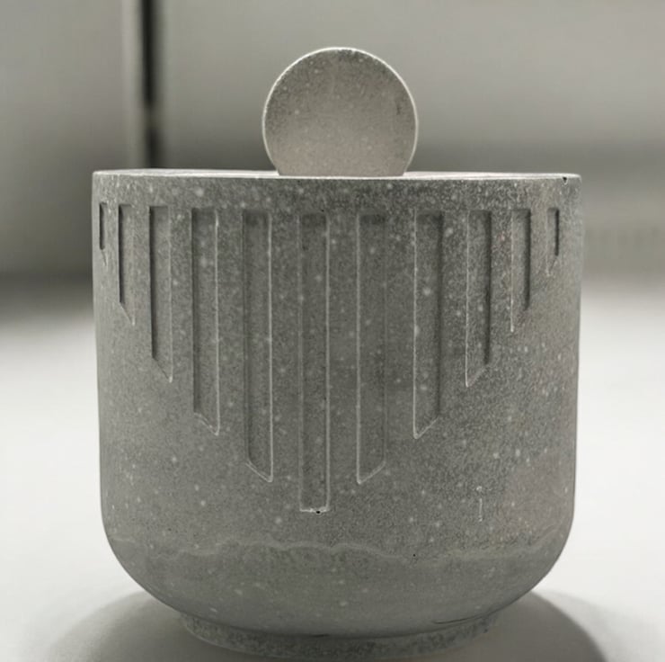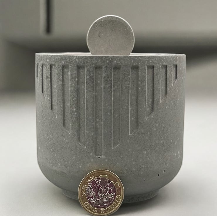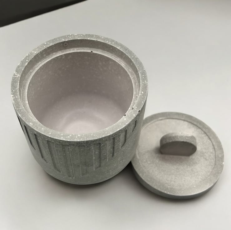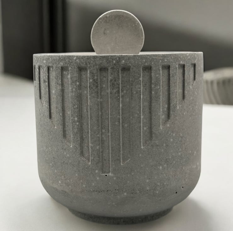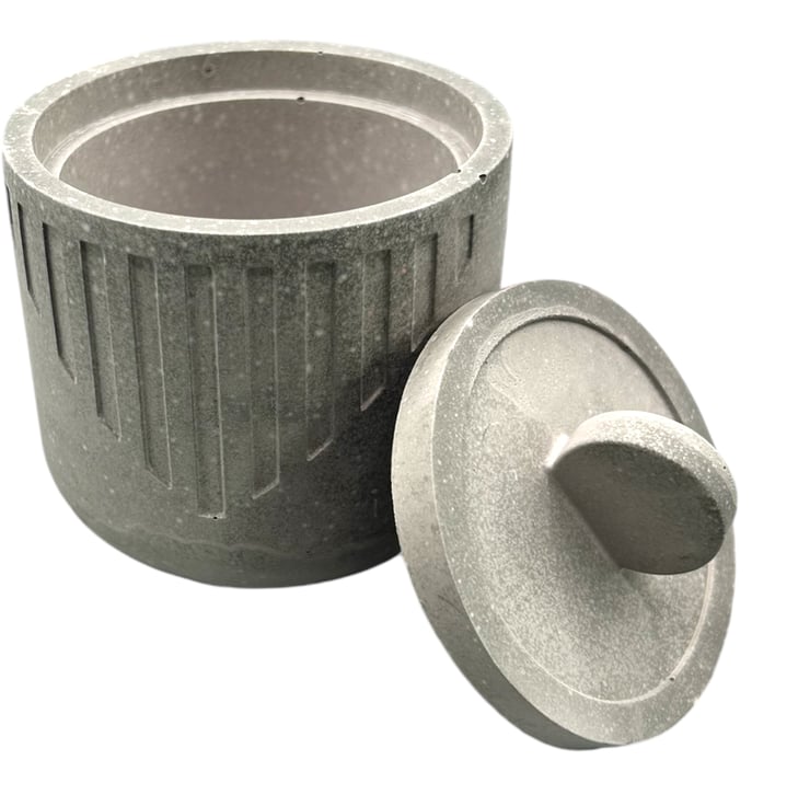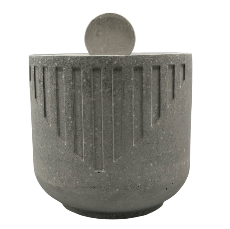 This grey jewellery box features a lid and imprinted lines forming an inverted triangle design. The pot is crafted from a premium alpha plaster, renowned for its use in marble and stone restoration and repair. With a smooth, durable finish akin to marble, it is both water and chip-resistant. It is perfect for storing your keepsakes, trinkets, jewellery or small treasures.
