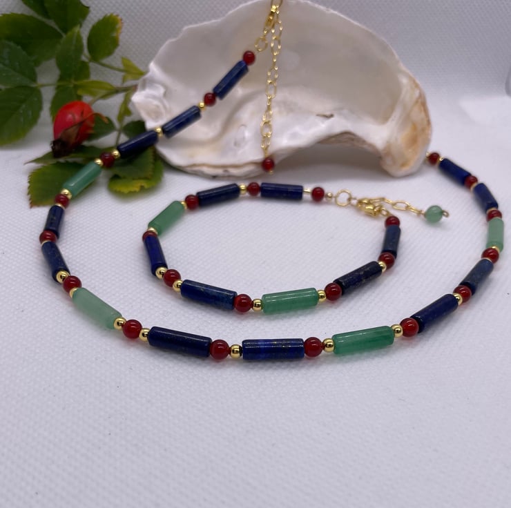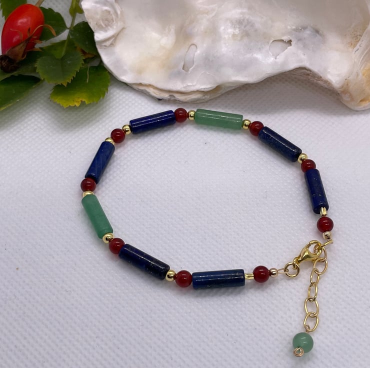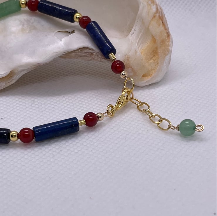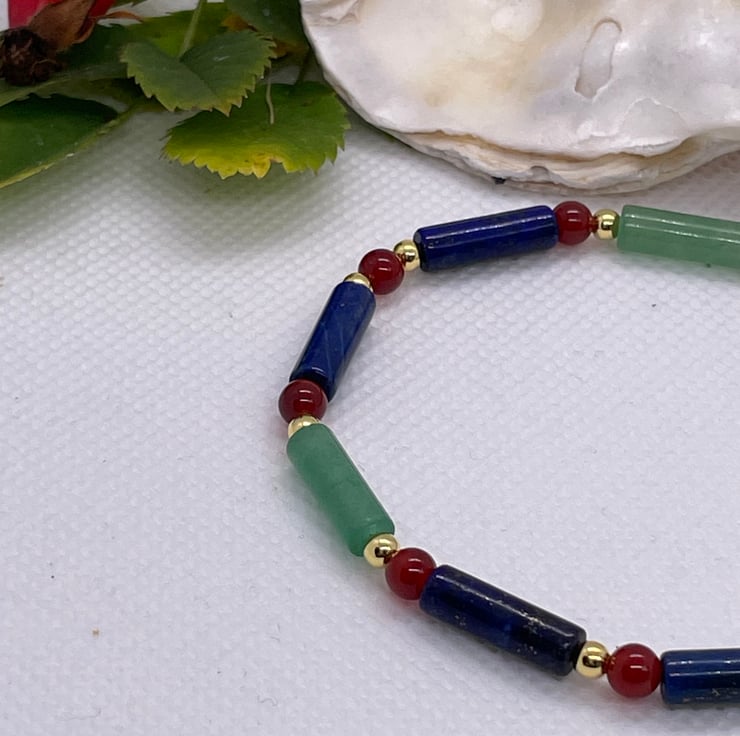 I made this bracelet using lapis lazuli and green aventurine tubular beads, interspersed with 4mm red agate and 24k gold vermeil beads.