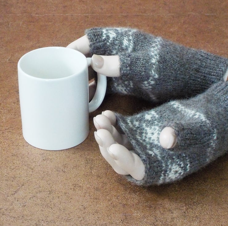 Classic Fairisle design gloves. I have hand-knit these lovely fingerless gloves using British Masham wool in a dark brown and cream Fairisle design. As usual I have knitted them "in the round" so there are no ugly uncomfortable seams, and the thumb is fully shaped.