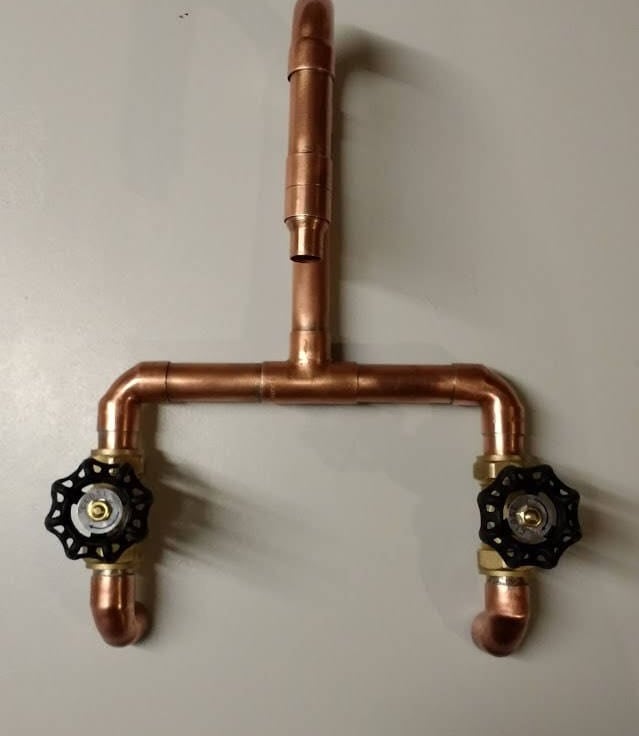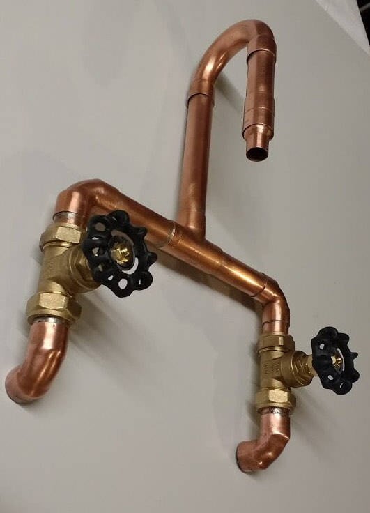 Bespoke kitchen or bathroom wall mounted taps. This is an example of the type of taps I can do. The taps can be wall or worktop mounted and many other styles are available. This particular style and size is made from 22mm pipe with black handled tap valves.