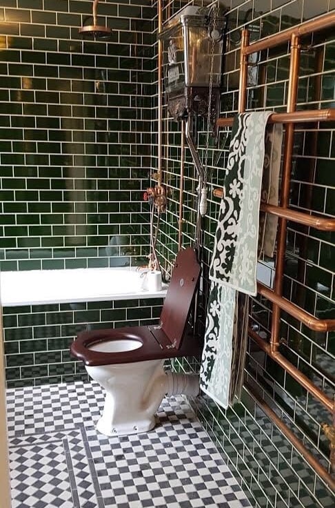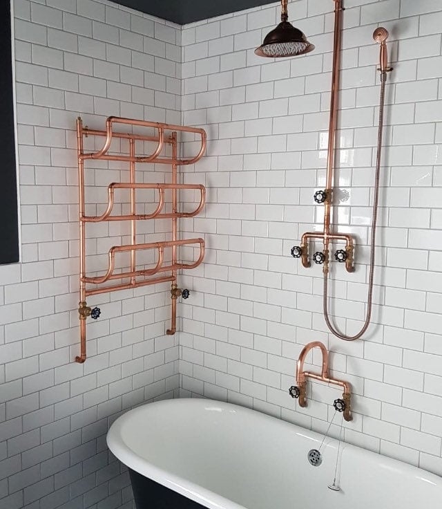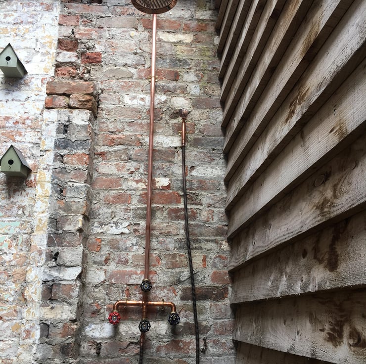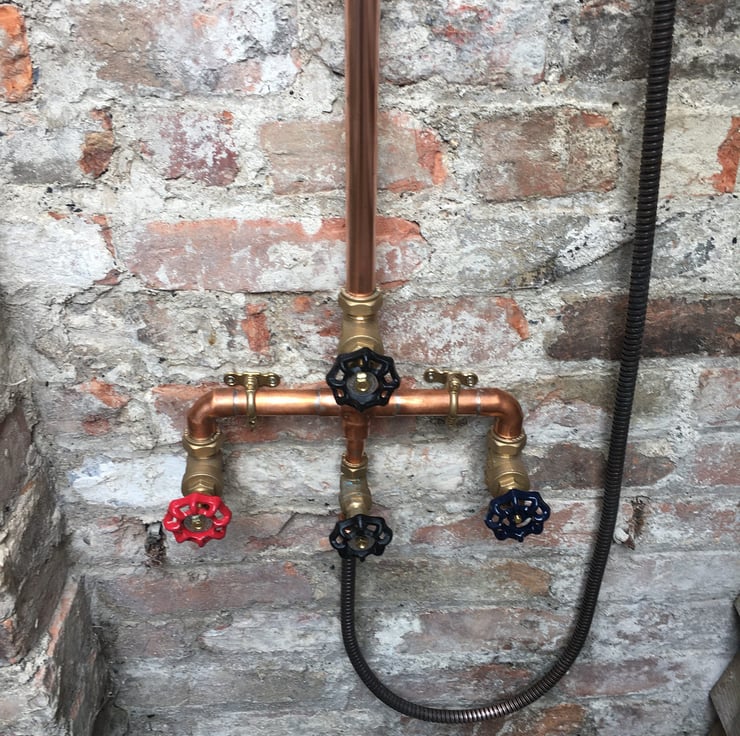 Bespoke and handmade copper mixer shower. This is an example of a recently commissioned item. I can make showers in many different designs. This particular style and size is made from 22mm pipe with gate valves, it has a 8 inch copper shower head and a separate hand held shower attachment head.