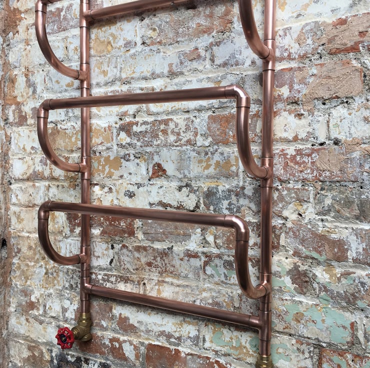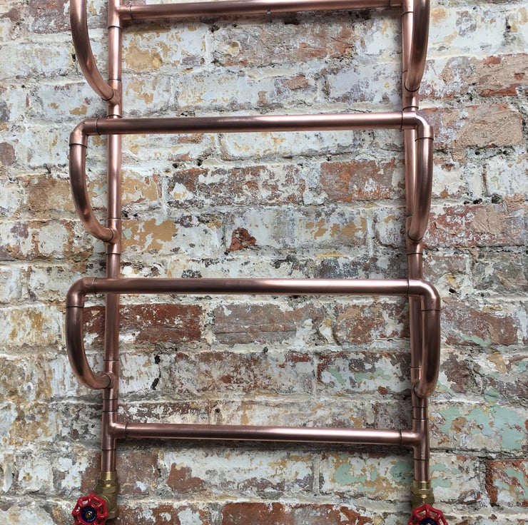 This handmade copper radiator is made from 22mm diameter copper pipe. The size is 50cm wide (measured centre to centre of pipe), 90cm high and 18cm deep.