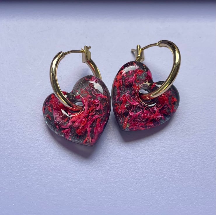 Gold-plated hoops with chunky resin charm. Swirls of pink and red create a rose petal effect on a grey/black background. Lightweight and comfortable to wear.