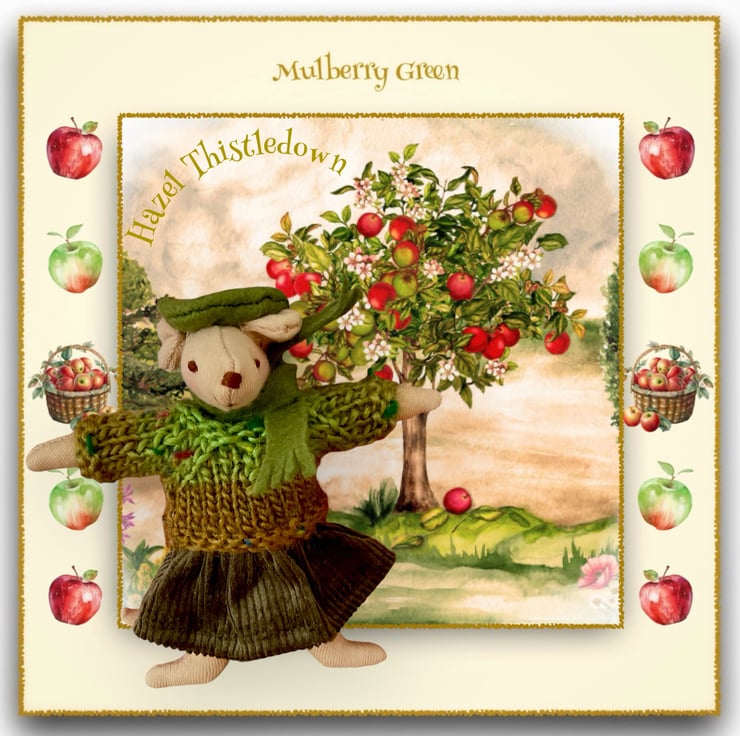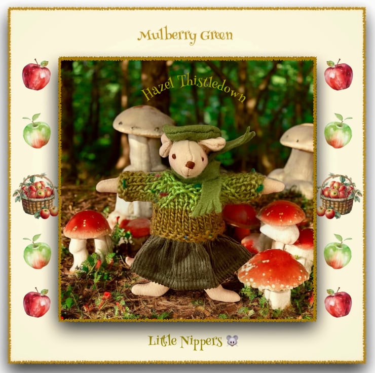Hazel Thistledown, amongst the toadstools, in her olive green corduroy skirt, green and brown shaded jumper and olive green scarf and beret, is one of the Little Nippers - tiny mice who live in a maze of tunnels underneath the barn at Mulberry Farm. All of the Little Nippers are named after herbs or meadow flowers. The Little Nippers are 13cm tall.