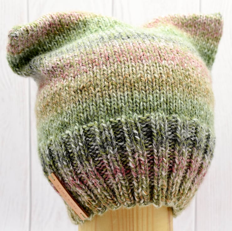 Hand knitted in a pretty green and pink chunky weight yarn. This cosy hat is knitted in a shape which can form kitty cat ears when worn.