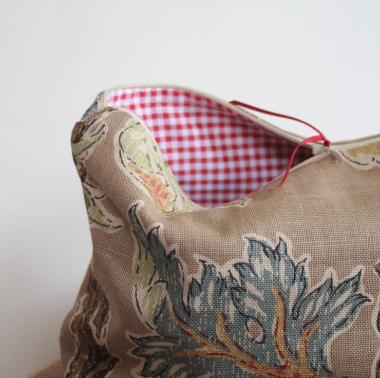 SAMPLE A simple, large, zip up pouch made from a remnant of brown floral linen fabric and lined with red and white gingham cotton.