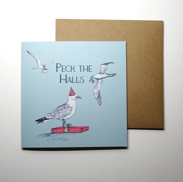 I really enjoyed creating my last collection featuring the coastal birds of North Northumberland and wanted to design a more playful set of illustrations that could be used at Christmas. These playful Christmas cards feature some of the birds from my Coastal Birds collection, including a puffin, eider duck and arctic tern - alongside some new additions (herring gull and gannet). I gave all of the birds some sort of festive extra, either them carrying a gift or wearing a party hat and clearly they're all of their way to meet the herring gull underneath the Christmas tree! I always enjoy a good greeting card pun, so I included some classics on these cards, including 'Eider Rather Spend Christmas with You', 'Sea-son's Greetings', 'Peck the Halls' and 'Merry Puffin Christmas'.
