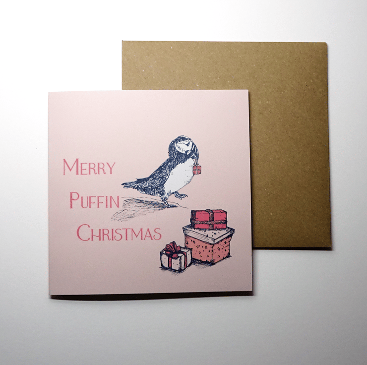 I really enjoyed creating my last collection featuring the coastal birds of North Northumberland and wanted to design a more playful set of illustrations that could be used at Christmas. These playful Christmas cards feature some of the birds from my Coastal Birds collection, including a puffin, eider duck and arctic tern - alongside some new additions (herring gull and gannet). I gave all of the birds some sort of festive extra, either them carrying a gift or wearing a party hat and clearly they're all of their way to meet the herring gull underneath the Christmas tree! I always enjoy a good greeting card pun, so I included some classics on these cards, including 'Eider Rather Spend Christmas with You', 'Sea-son's Greetings', 'Peck the Halls' and 'Merry Puffin Christmas'.