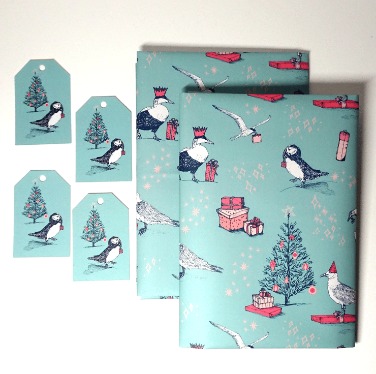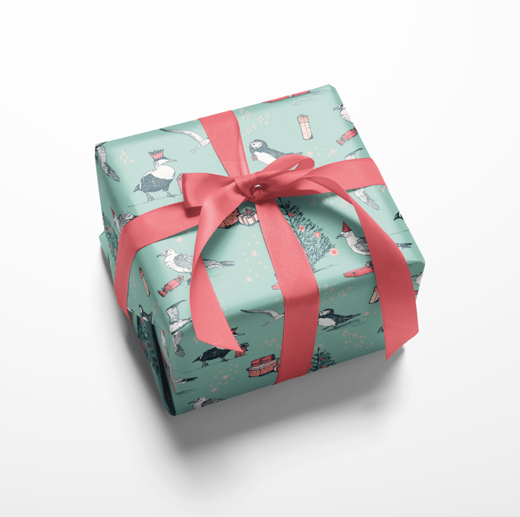 Come to the party - everyone's invited! This jolly selection of festive coastal birds will bring a touch of playful charm to your Christmas gifting this year with this eco-friendly wrapping paper and matching gift tags. A collection of hand-drawn illustrations of a herring gull, puffin, arctic tern, gannet and an eider duck, complete with festive gifts and party hats in a fresh, modern colour palette of turquoise, pinks and blues.