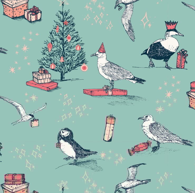I really enjoyed creating my last collection featuring the coastal birds of North Northumberland and wanted to design a more playful set of illustrations that could be used at Christmas. Come to the party features some of the birds from my Coastal Birds collection, including a puffin, eider duck and arctic tern - alongside some new additions (herring gull and gannet). I gave all of the birds some sort of festive extra, either them carrying a gift or wearing a party hat and clearly they're all of their way to meet the herring gull underneath the Christmas tree!