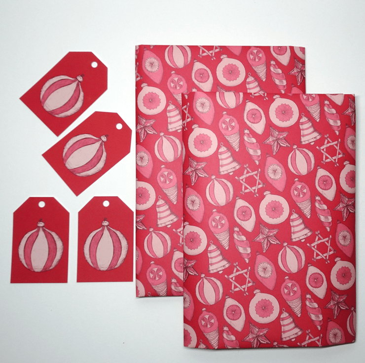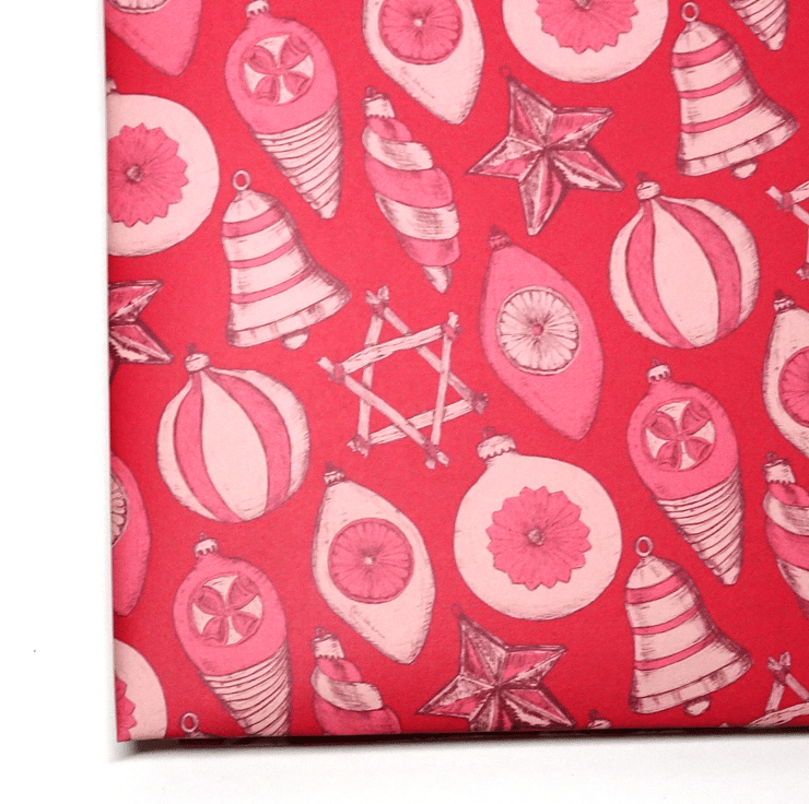 Bring a touch of vintage charm to your Christmas gifting this year with my Vintage Baubles wrapping paper and matching gift tags. Hand-drawn illustrations of different-shaped vintage glass Christmas tree decorations have been coloured in shades of Red and Pink for a modern twist on a classic theme.