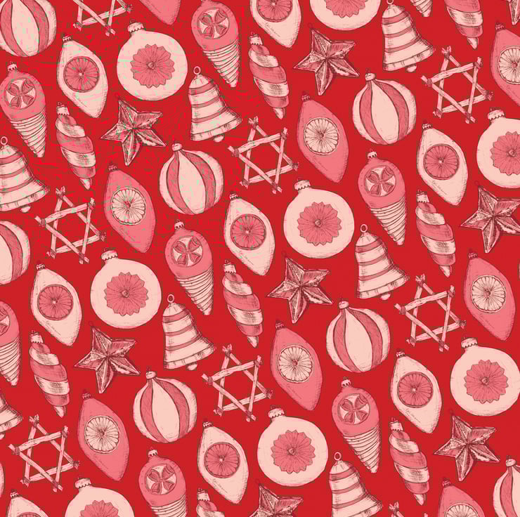 I always love looking in the windows of the vintage shops in town - every year from November they start to display old-fashioned Christmas decorations and I think the vintage glass baubles are particularly pretty. So I used them as the inspiration for this design. Each bauble is hand-drawn in ink before being digitised and having colour added. I chose shades of red and pink for a modern colour palette.