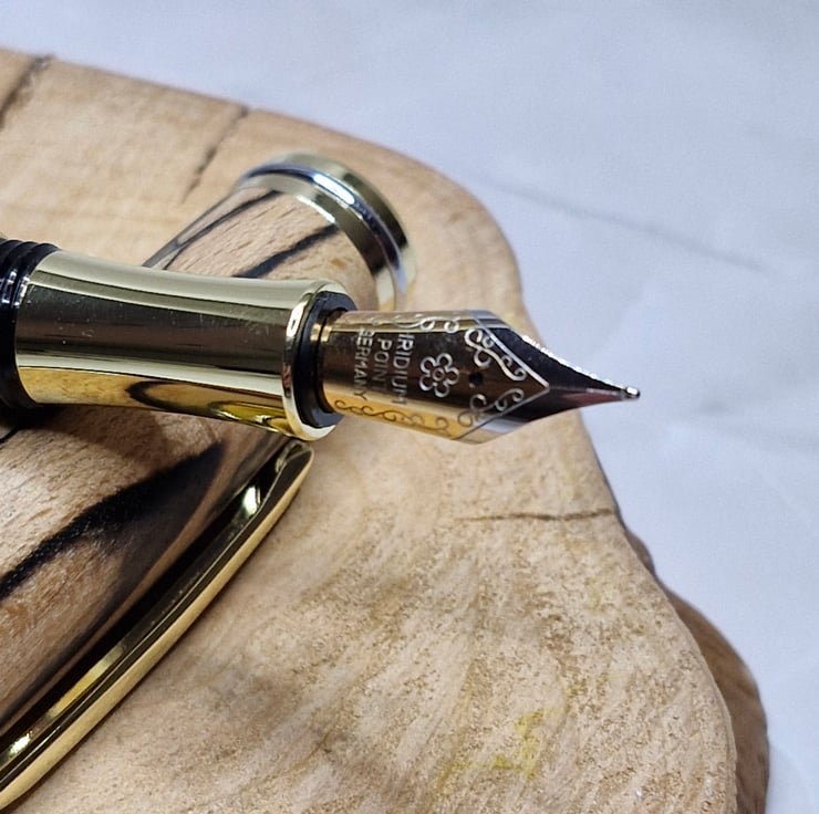 This pen is gold plated, with a silver band and end cap on the lid, as well as stunning engraving on the nib.
