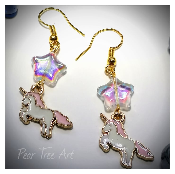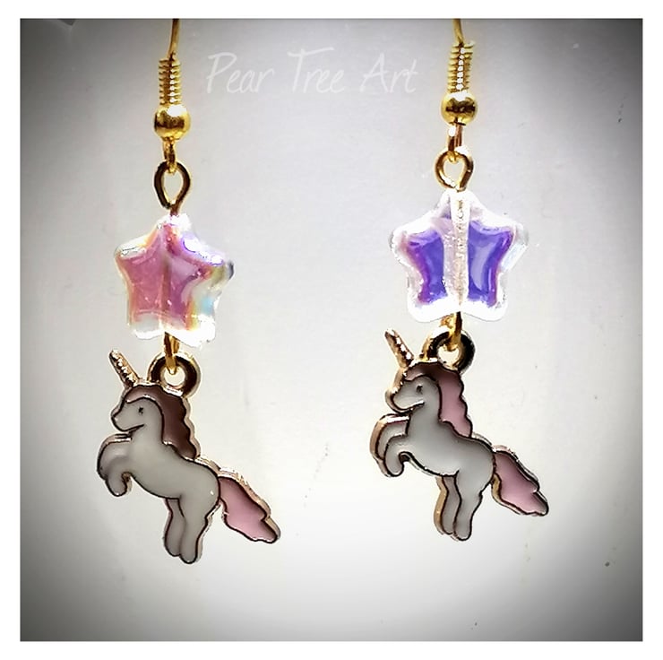 "These handmade pink unicorn earrings feature delicate glass star beads, perfect for unicorn lovers or as a whimsical gift. These magical earrings add a touch of fantasy to any outfit."