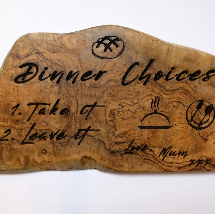 The inspiration behind this handcrafted wooden sign stems from a blend of humor and heartfelt warmth, perfect for adding a personal touch to your kitchen. The playful message reflects a loving and lighthearted approach to mealtime. Designed to make family dinners more enjoyable, this sign combines a touch of wit with the familiar charm of home. Crafted with care and finished with a clear varnish, it’s a unique way to bring a smile to your face and a bit of fun to your dining space.