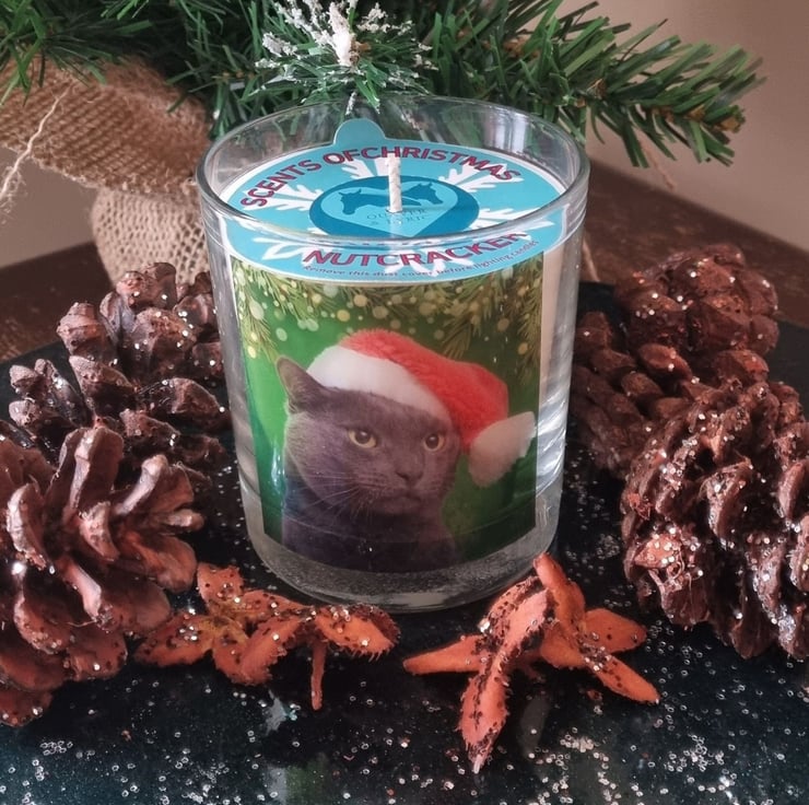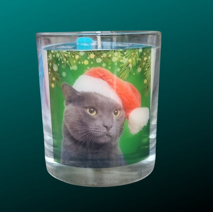 A Christmas scented candle with a gorgeous grey cat in a Santa hat design. Available in 6 seasonal fragrances to add the aroma of Xmas magic to your home. Handmade in Northants using a high quality rapeseed and coconut wax blend, the finest range fragrances, poured into quality glass containers and supplied in a kraft box.
