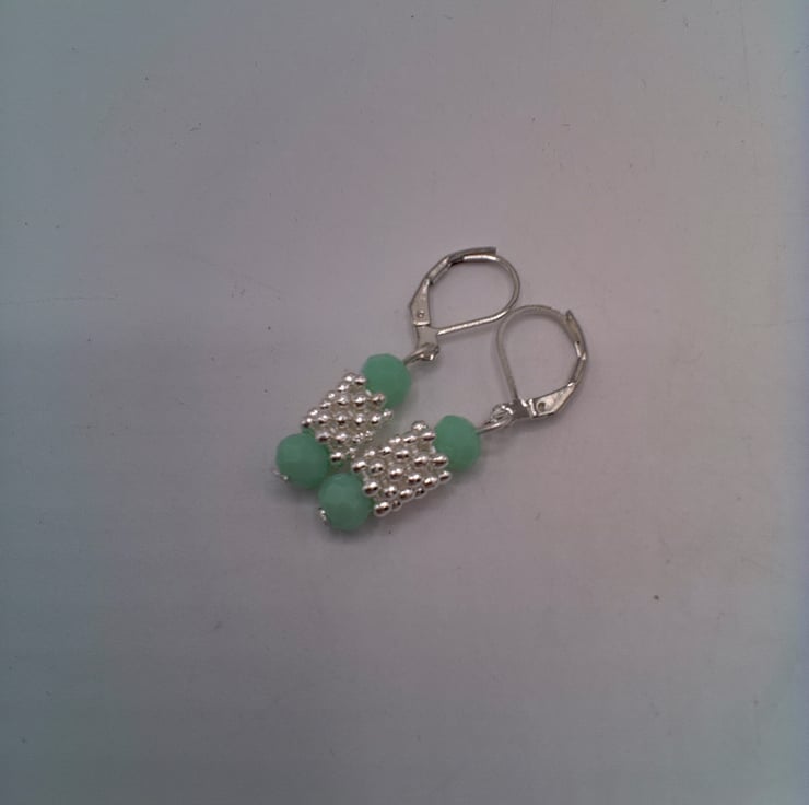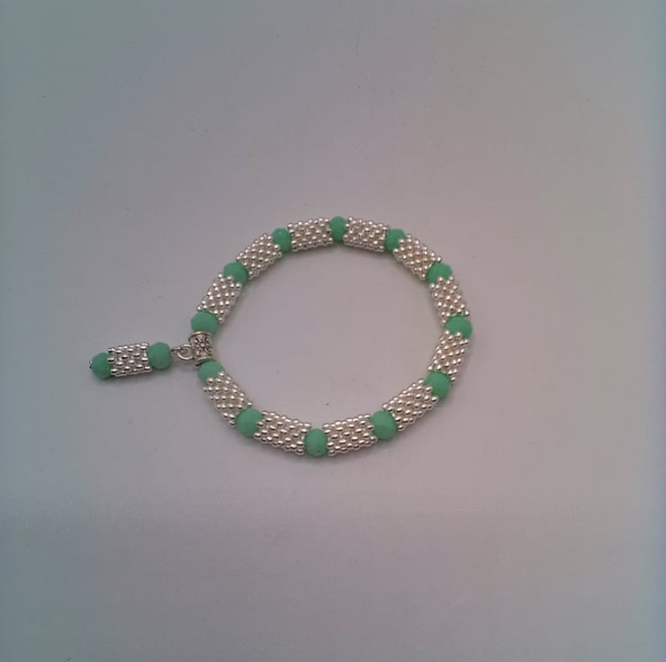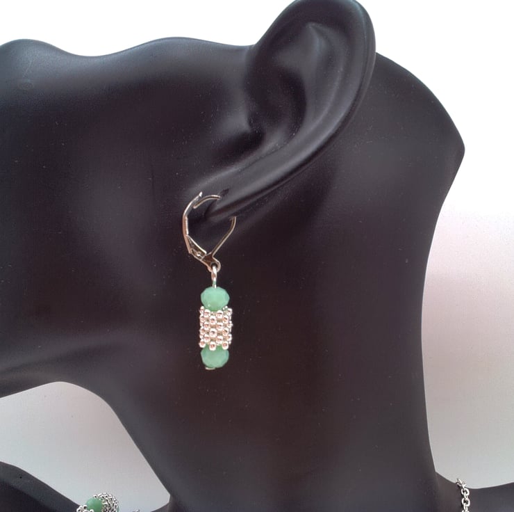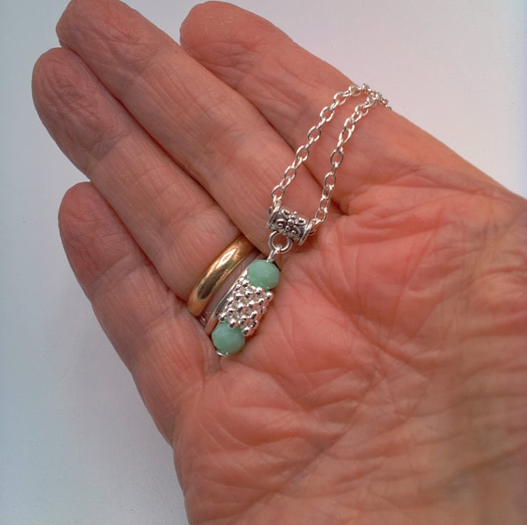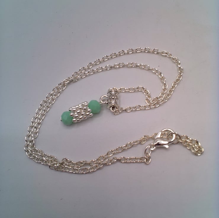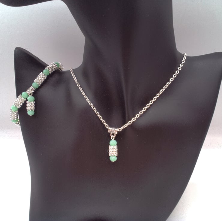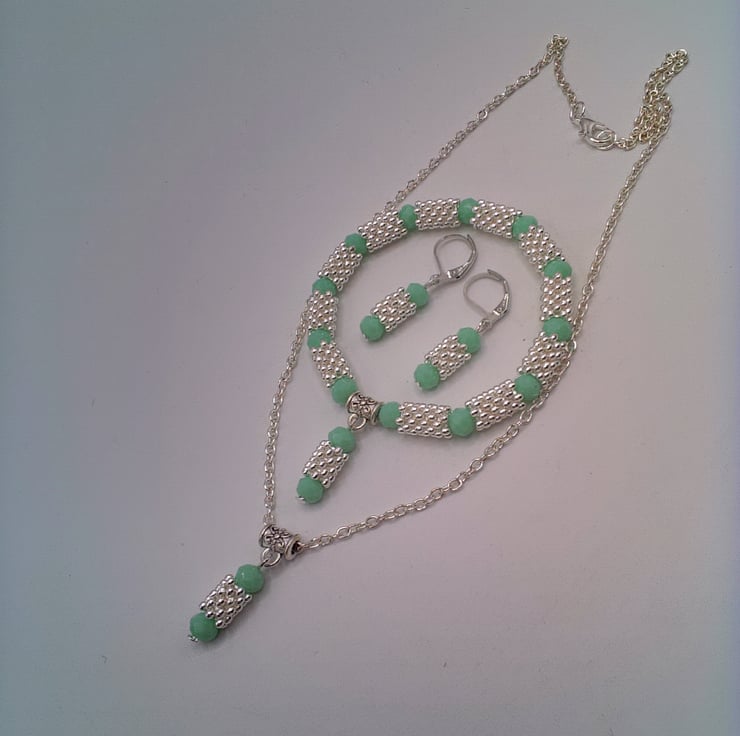 This pretty jewellery set comprises a necklace, bracelet and pair of earrings which is light and easy to wear. It would look great for a special day out or evening get together. The pendant is made using two 6 mm x 4 mm mint green faceted beads and six 6 mm silver plated snowflake spacer beads suspended on an 18 inch silver plated chain fastened with a silver plated lobster clasp. The bracelet uses the mint green faceted beads and silver plated snowflake spacer beads threaded onto jeweller's elastic. The earrings use the same beads used for the pendant and they are suspended on silver plated lever backs. The necklace is 18 inches (46 cm) in length, the bracelet is 7 inches (17.25 cm) in diameter and the earrings have a drop of 0.75 inch (2 cm) from the base of the ear wire. The jewellery set will be dispatched wrapped in tissue paper in an organza bag and be delivered via Royal Mail first class post. The set would make a lovely gift for a jewellery loving lady.