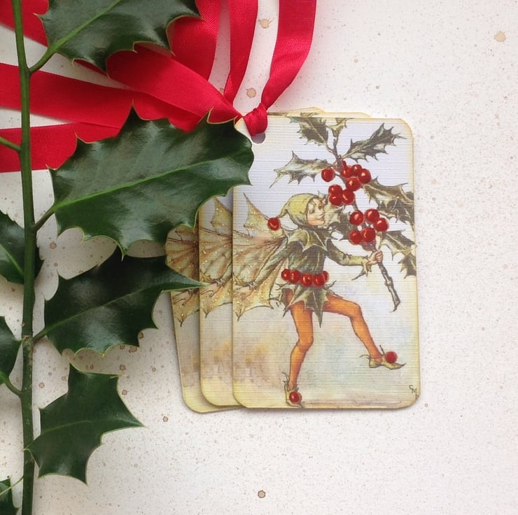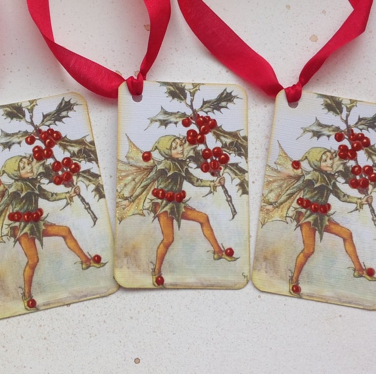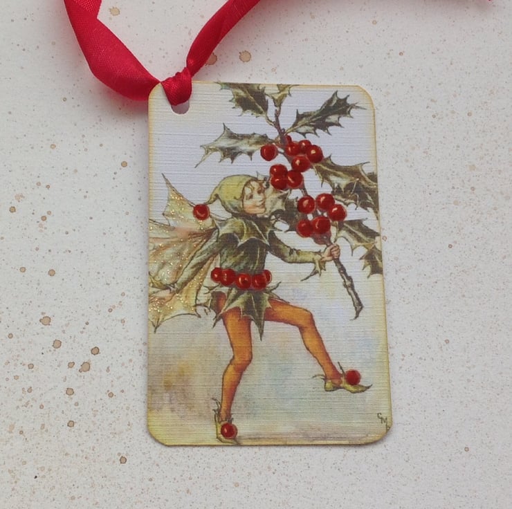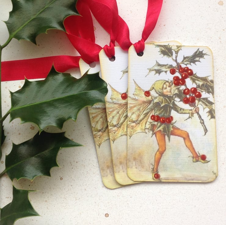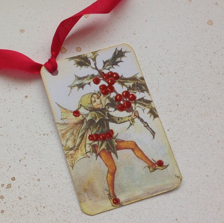 Lovely classic, vintage image of the Holly Flower Fairy. I have printed these images on to high quality linen-look (285gsm) card .Of course there has to some shimmer! and so I have added the necessary ink, glaze and glitter .Finished with lovely ,silky ,vintage -style ribbon !!