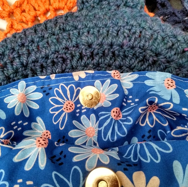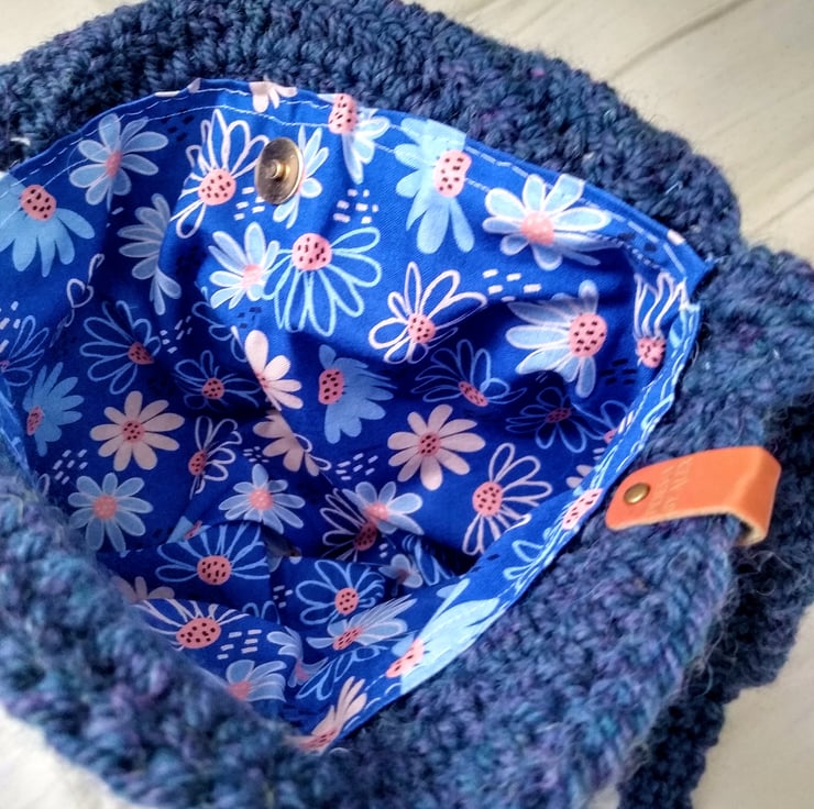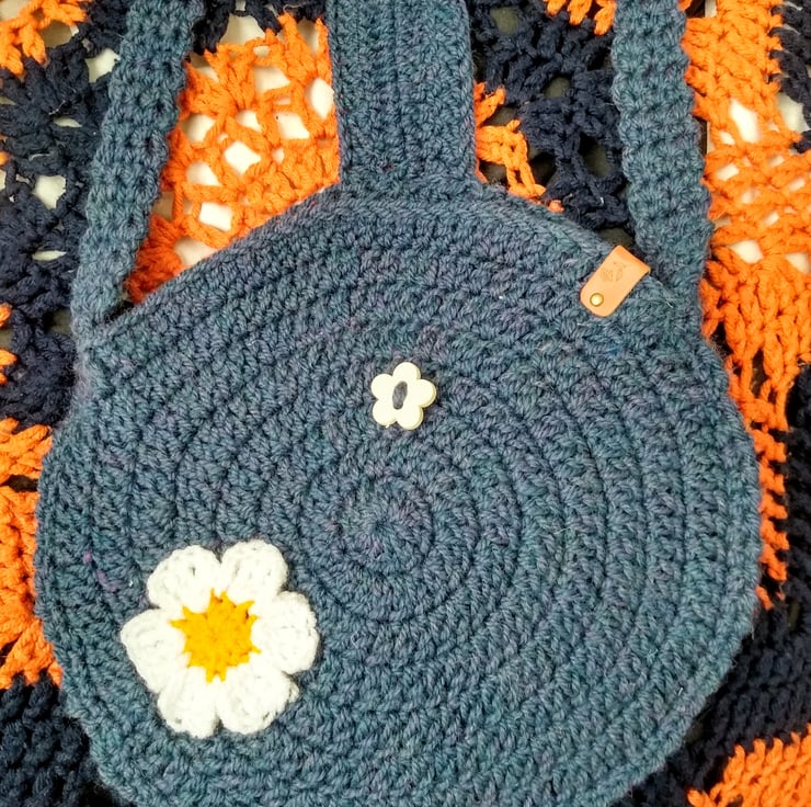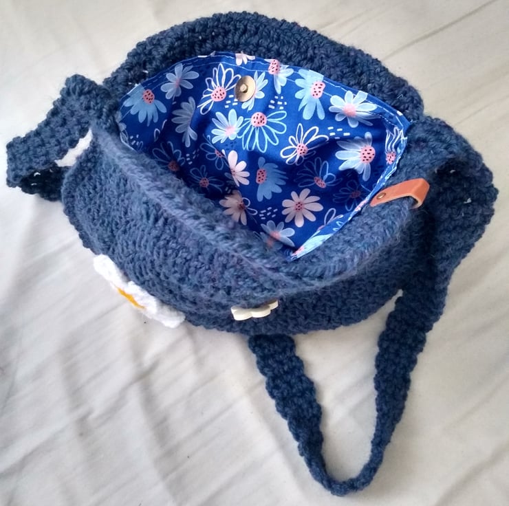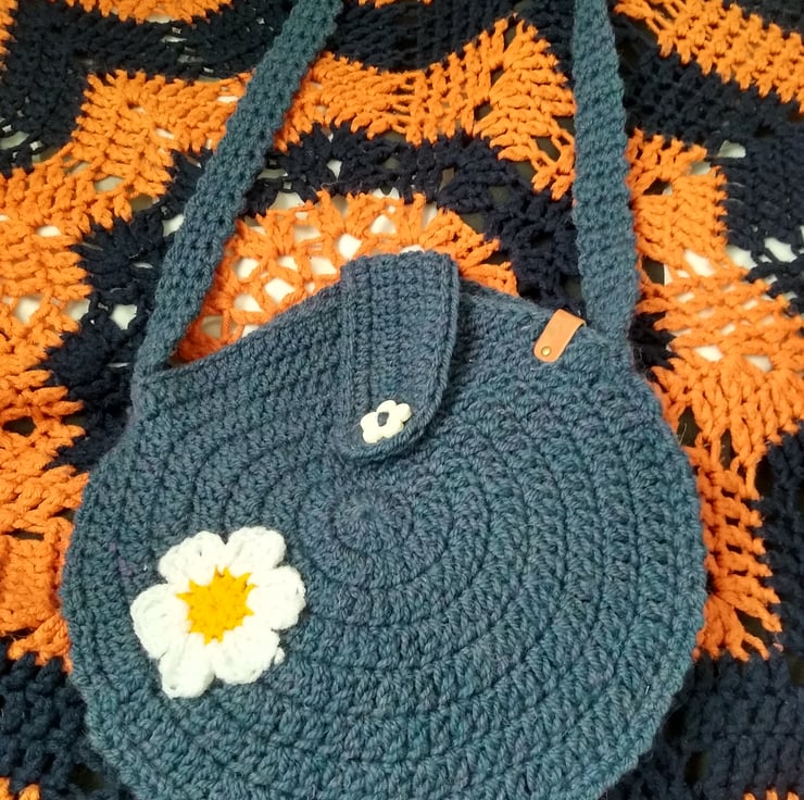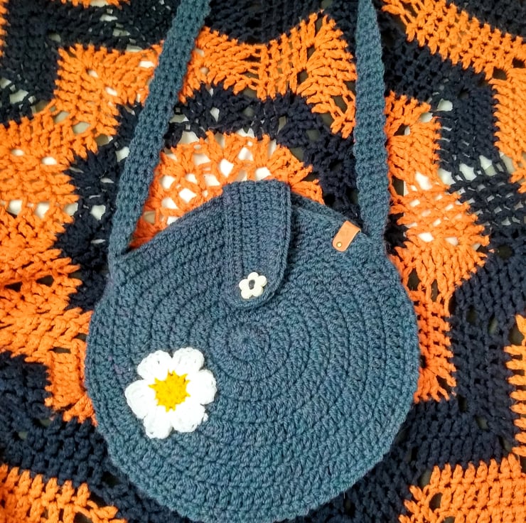 This stylish crossbody bag is made from pure British wool from West Yorkshire, and features a cute crochet daisy appliqué. It is fully lined with cotton fabric that has a fun, retro daisy design. For added security, the bag has a discreet magnetic clasp inside, as well as a 60s style daisy button on the front.