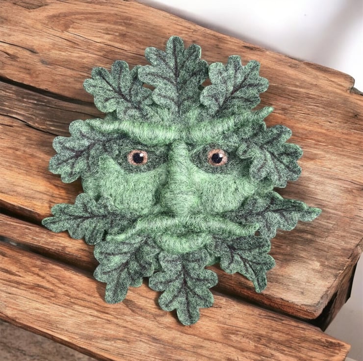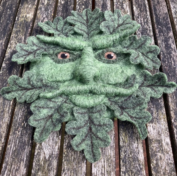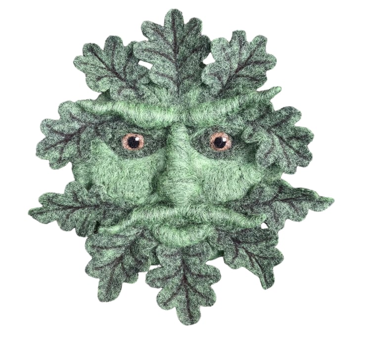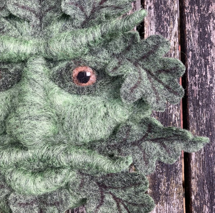 This fabulous green man is a needle felted woollen sculpture. The green man is traditionally thought of as a symbol for rebirth and is a popular wall decoration.