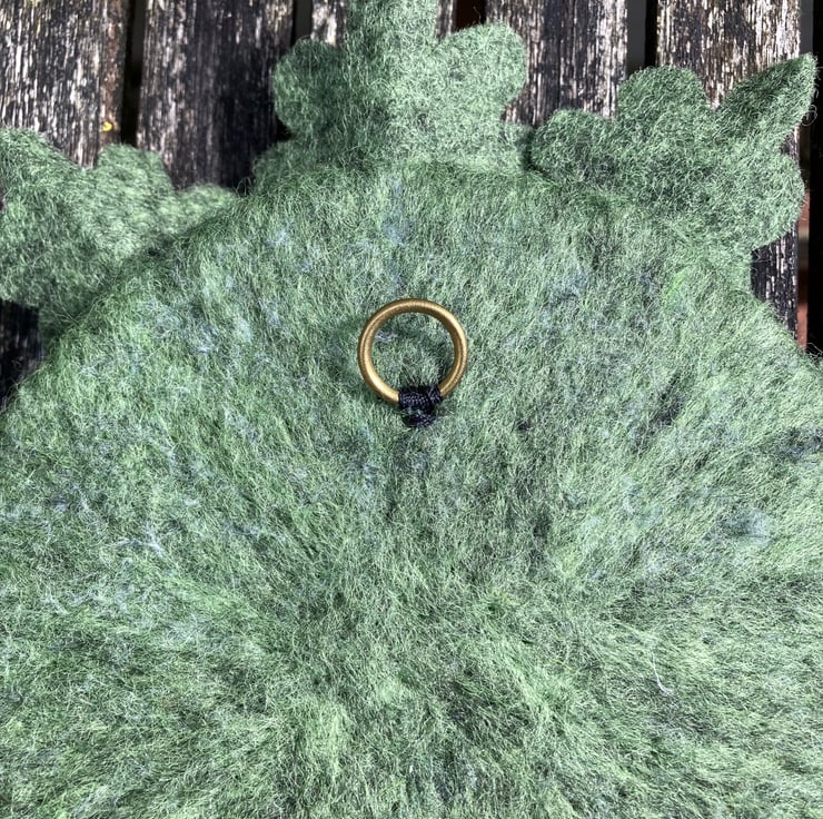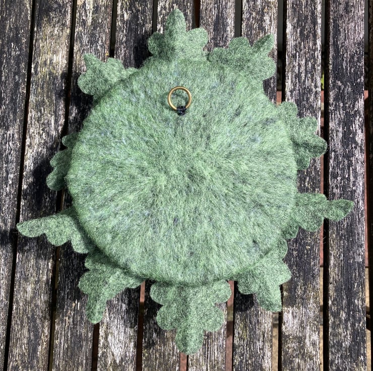 Green woollen fibres have been used to create the circular base and features of this green man. These fibres have been needle felted using a barbed felting needle to bind them together and sculpt them into shape. Oak leaves have been cut from a sheet of hand wet felted green felt and needle felted into place around the circumference. The eyebrows and moustache have been formed by wrapping wool fibres around wire allowing them to be gently shaped as required. A small brass ring has been secured to the reverse of the sculpture to facilitate hanging.
