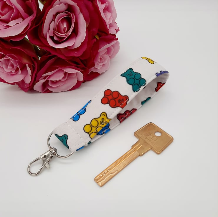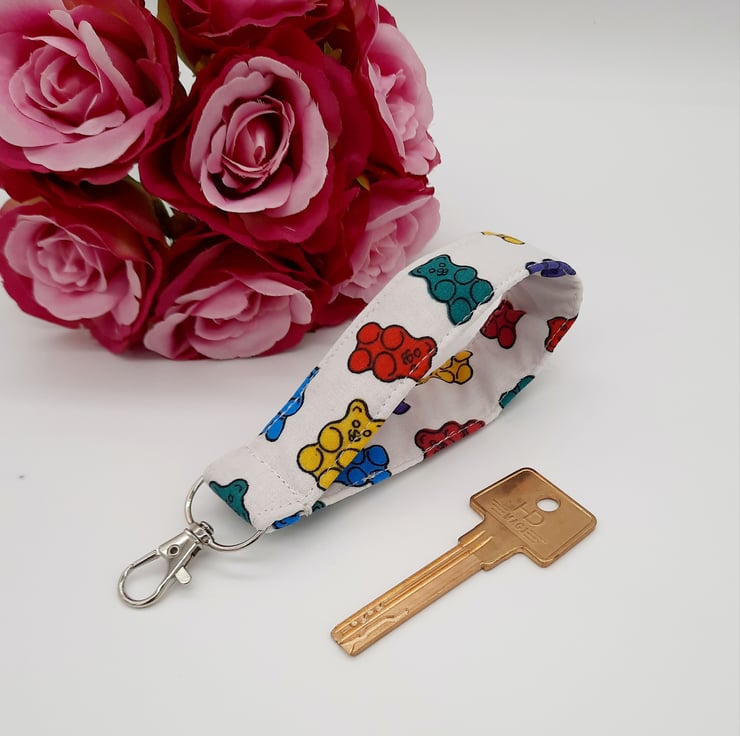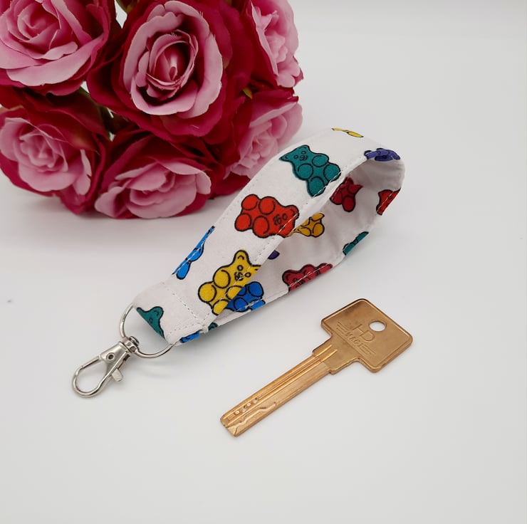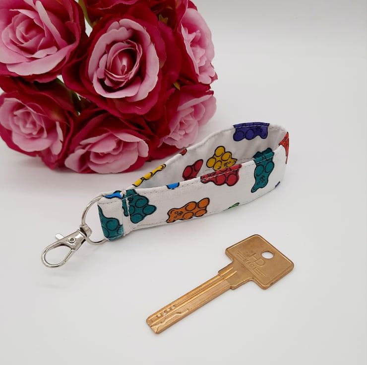Here I have a small keyfob wristlet. Made using a white cotton with multi coloured gummy bears printed on it.