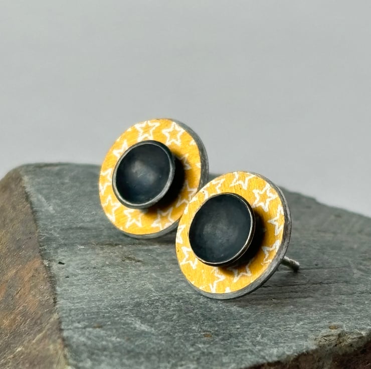 Add a pop of colour to your day with this fab pair of studs made from anodised aluminium and sterling silver. The yellow discs have a star print and the sterling silver domed studs are oxidised to a dark grey finish. The silver domes can be worn alone or with the yellow discs.The pattern on the aluminium part is made using a resist which is hand drawn and applied to the metal before being dyed and sealed.
