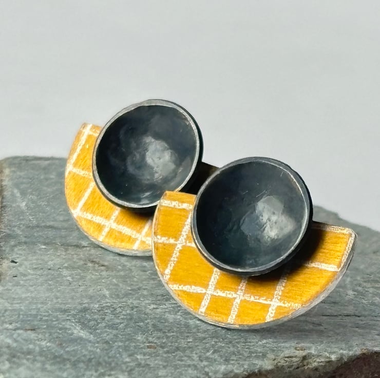 This fab pair of studs can be worn in 2 ways… they are made from anodised aluminium and sterling silver. The yellow semi circles have a crosshatch print and the sterling silver domed studs have a oxidised finish. The silver domes can be worn alone or with the yellow semi circles.The pattern on the aluminium part is made using a resist which is hand drawn and applied to the metal before being dyed and sealed.