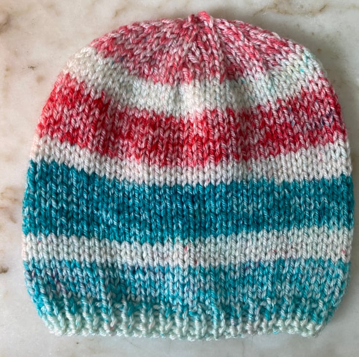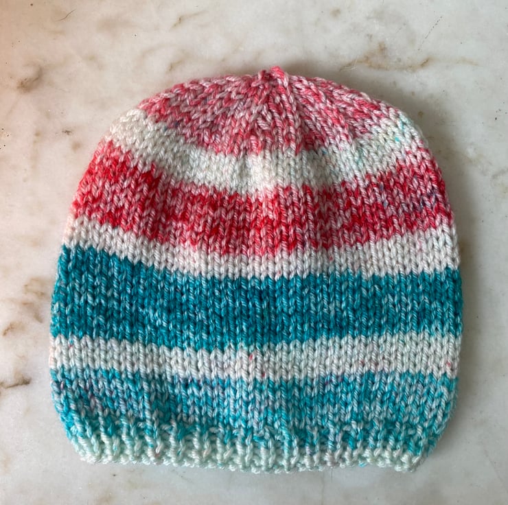 Gorgeous knitted stripy beanie hat for the new wee boy or girl in your life. Size 0-3 months.