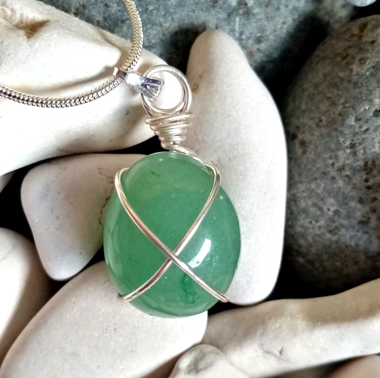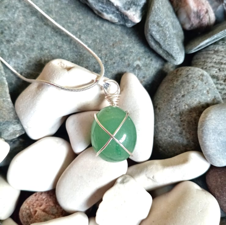 Wire-wrapped natural Aventurine tumble stone with silver plated snake chain.